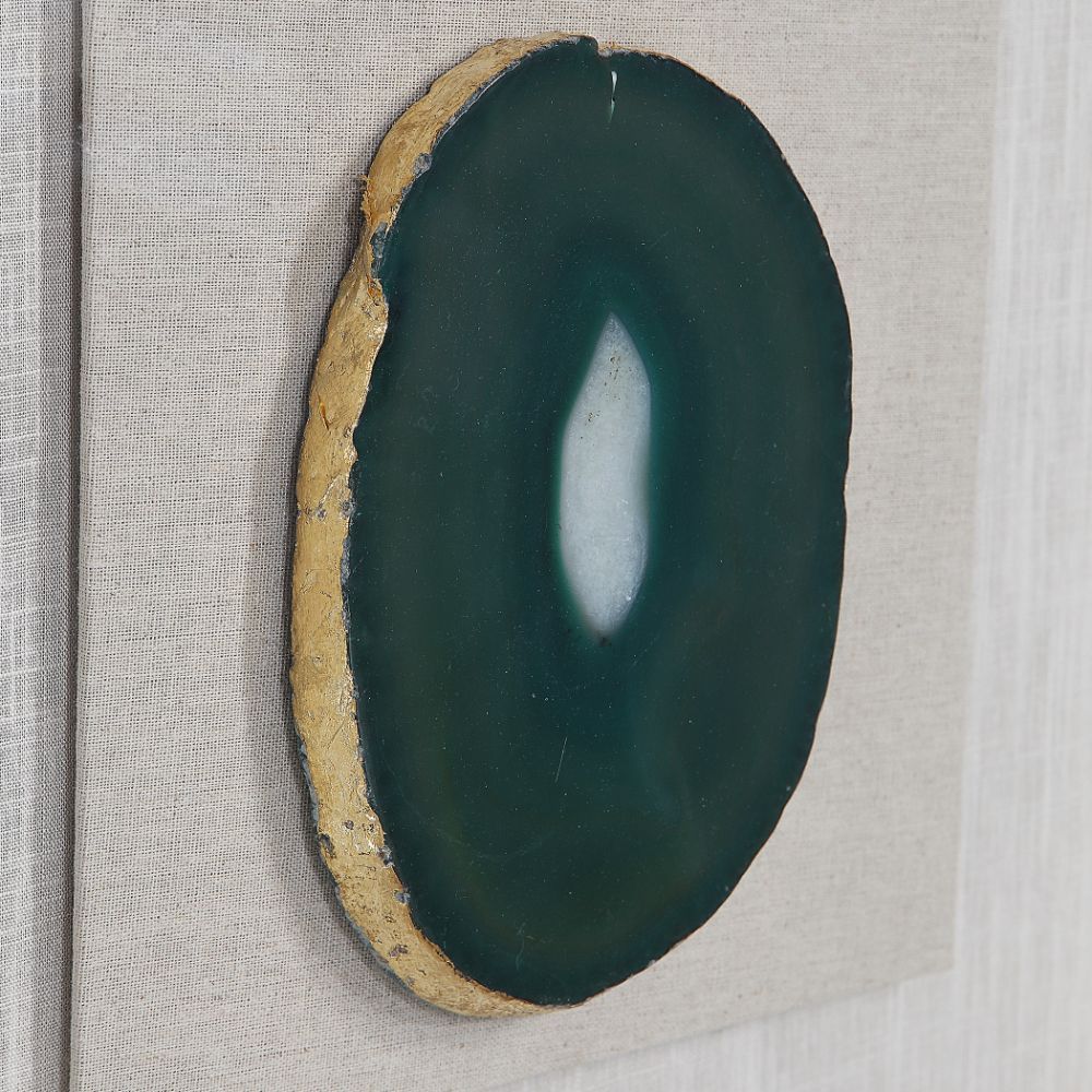 A Pine Wood Shadow Box Featuring A Hand Applied Gold Leaf Finish Showcases A Striking Emerald Green Agate Stone with White Veining, Accented with Hand Painted Gold Edging. Mounted on An Off-white Linen Backing.
