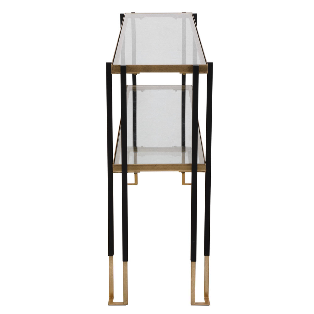 Featuring A Clean Lined Solid Iron Frame, This Contemporary Console is Finished in A Two-toned Matte Black and Gold Leaf. Has Two Tempered Glass Shelves.