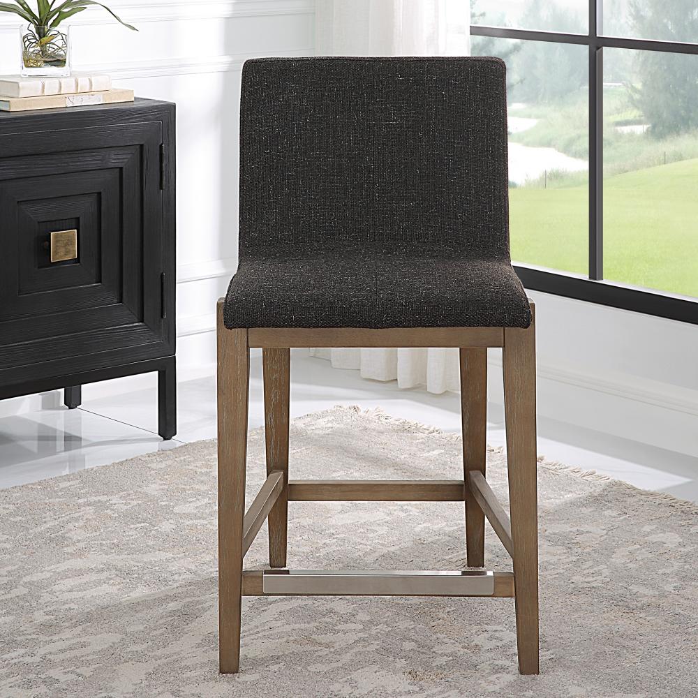 Gently Sloped Padded Seat in A Casual Charcoal Brown Polyester Fabric Rests Within A Solid Birch Wood Frame Finished in Light Walnut, with A Brushed Nickel Metal Kick Plate. Seat Height is 26".