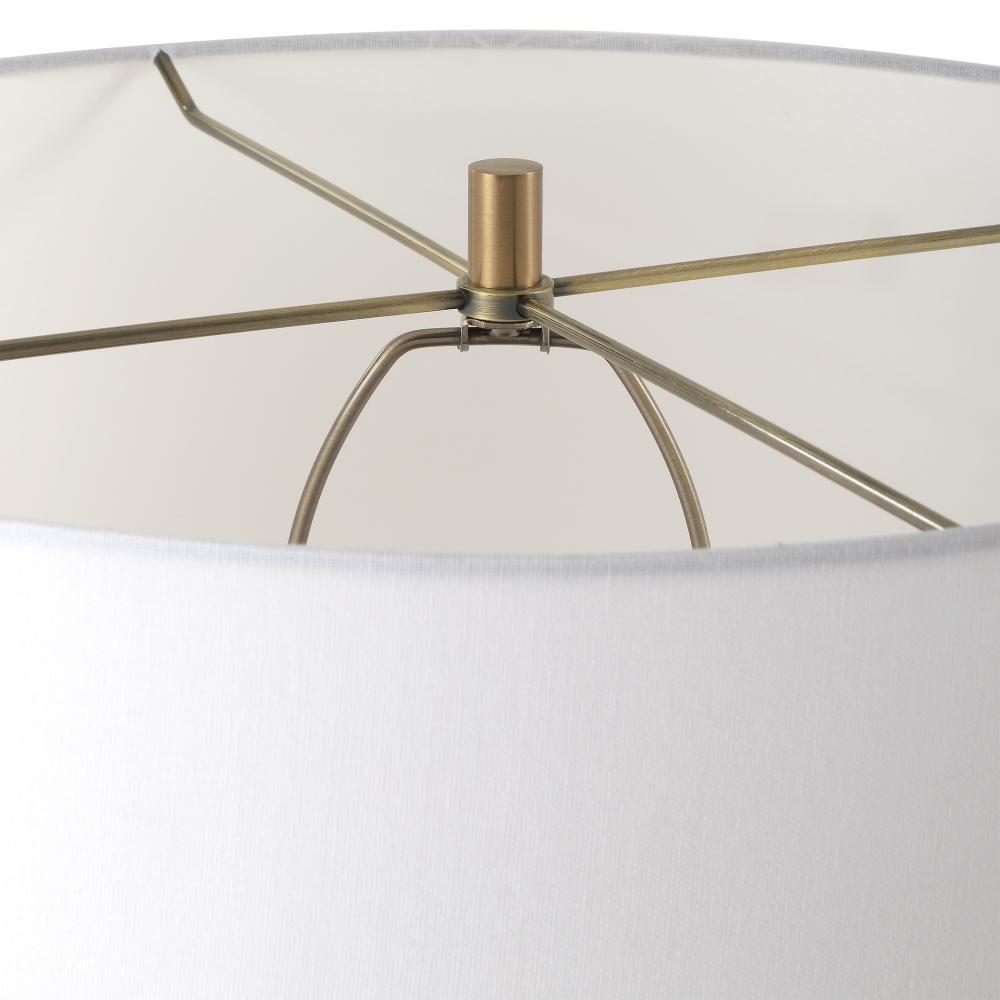 The Knox Floor Lamp Showcases A Solid Travertine Column Displayed On A Matching Antique Brass Plated Body. The Round Hardback Drum Shade Is A Casual White Linen Fabric.