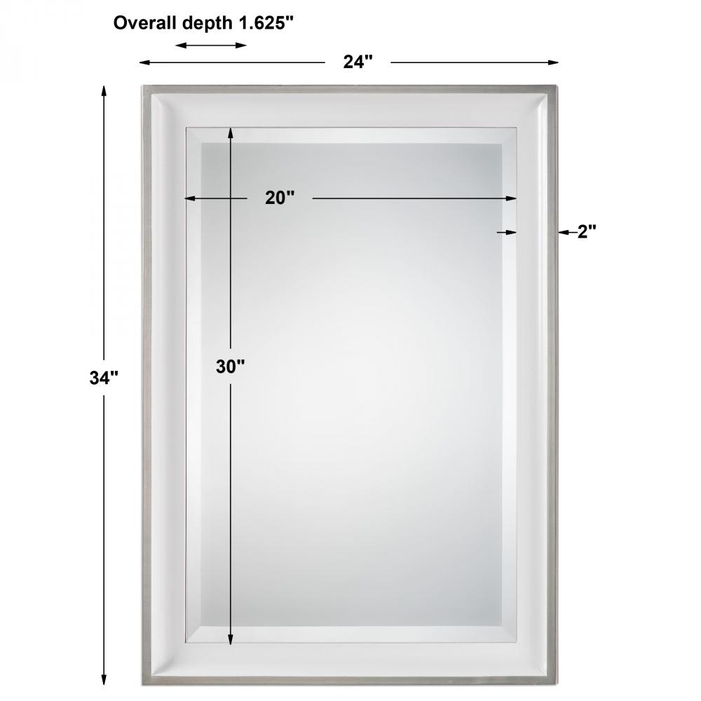 Sloped Profile Frame Finished in Gloss White, Accented with A Silver Leaf Outer Edge. Mirror is Beveled and May Be Hung Horizontal or Vertical.