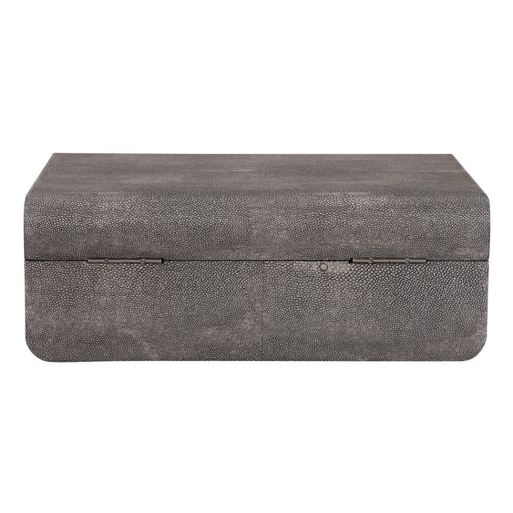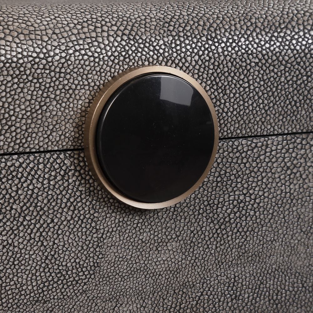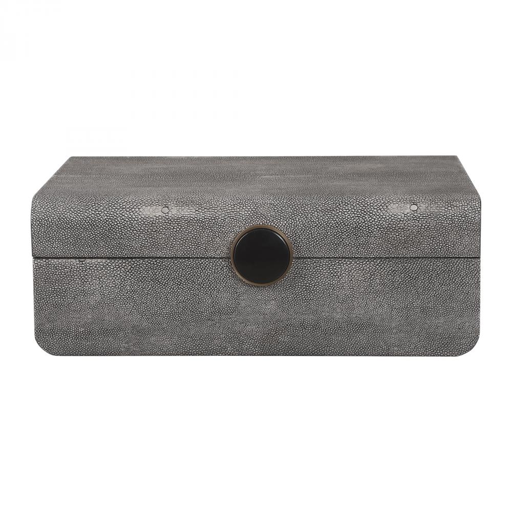 Inspired By The Art Deco Era, This Decorative Box Showcases A Faux Smoke Gray Shagreen Wrapped Exterior Accented By A Brushed Antique Brass and Black Enamel Closure. The Interior is Finished in Matte Black.