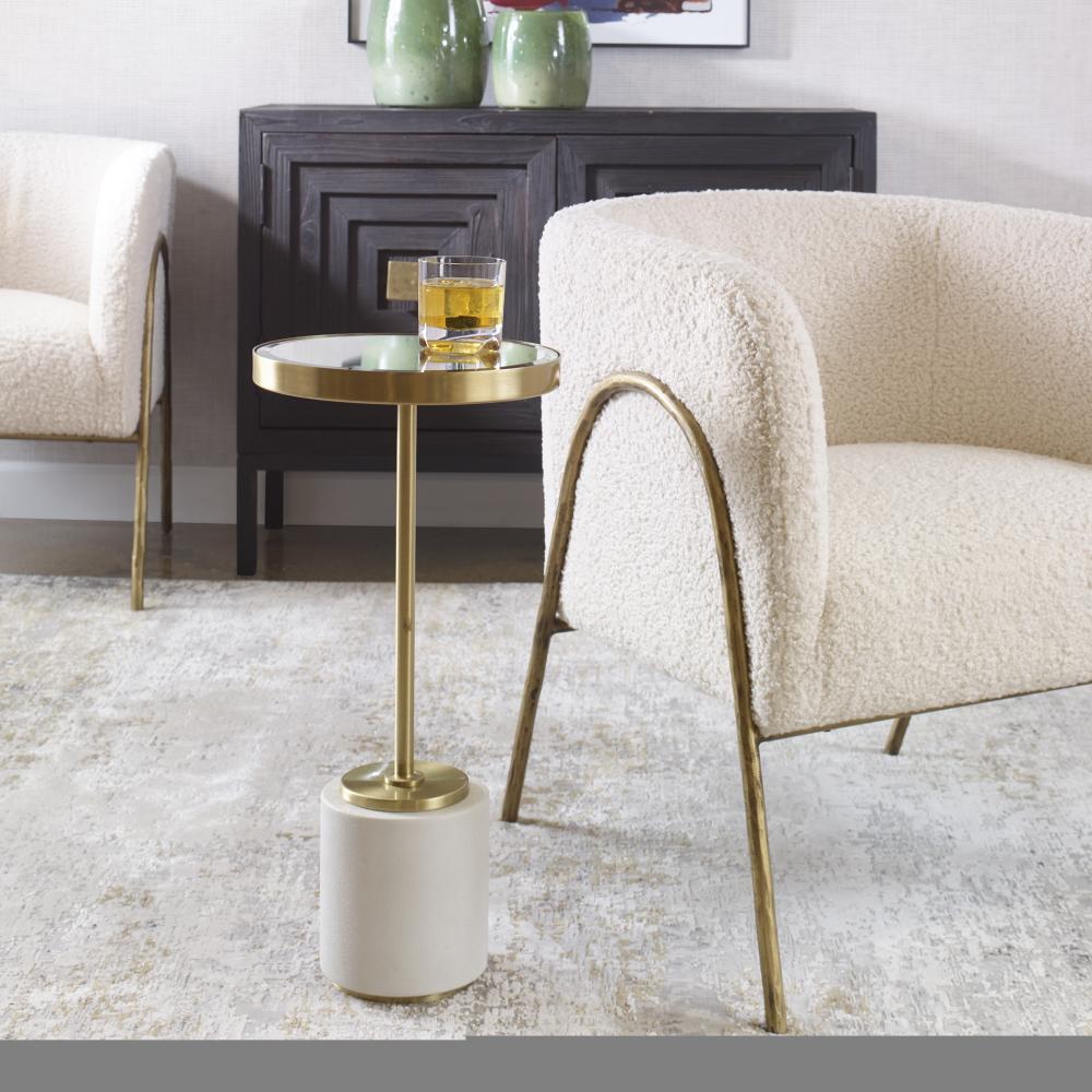 Stylish and Sophisticated, This Round Accent Table Features A Fresh White Faux Shagreen Base Paired with An Iron Support in Rich Brushed Brass and A Beveled Mirror Top.