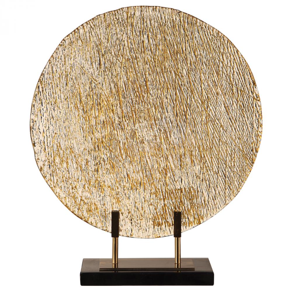 Clear, Rippled Art Glass Charger Featuring A Subtle Crosshatch Texture on The Reverse with Bright Gold Accents Displayed on A Bronze, Steel Stand with Black Marble Base.