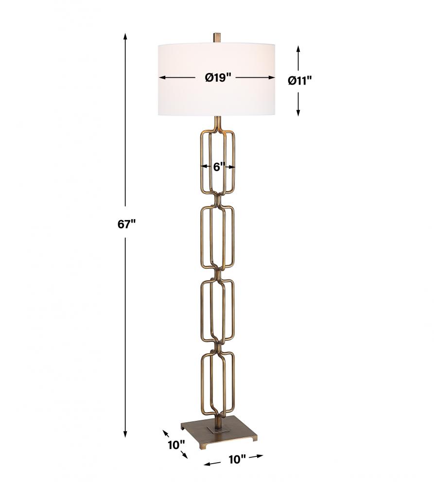 The Link Floor Lamp Features A Unique Design Made From Hand Forged Iron, Finished in A Heavily Antique Brushed Gold. The Hardback Drum Shade is Covered in A White Linen Fabric.