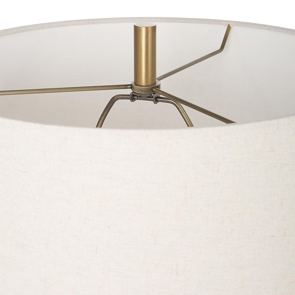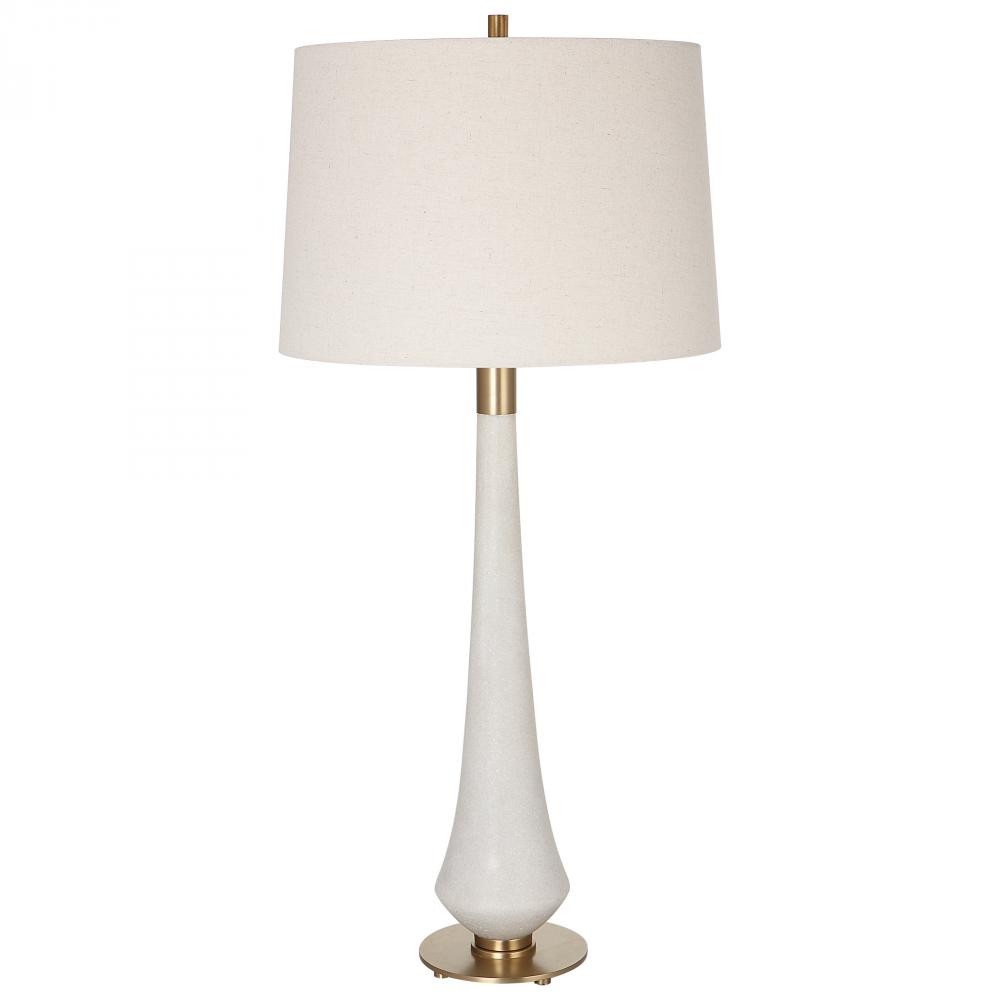 This Table Lamp Adds An Air of Elegance and Sophistication to Any Space. The Body of The Lamp is Crafted From Ivory Man-made Stone That Accurately Replicates The Look of Thassos Marble and is Accented By Iron Details Finished in Brushed Brass. The Tapered Hardback Drum Shade is Covered in A Casual Light Khaki Fabric with Natural Slubbing.