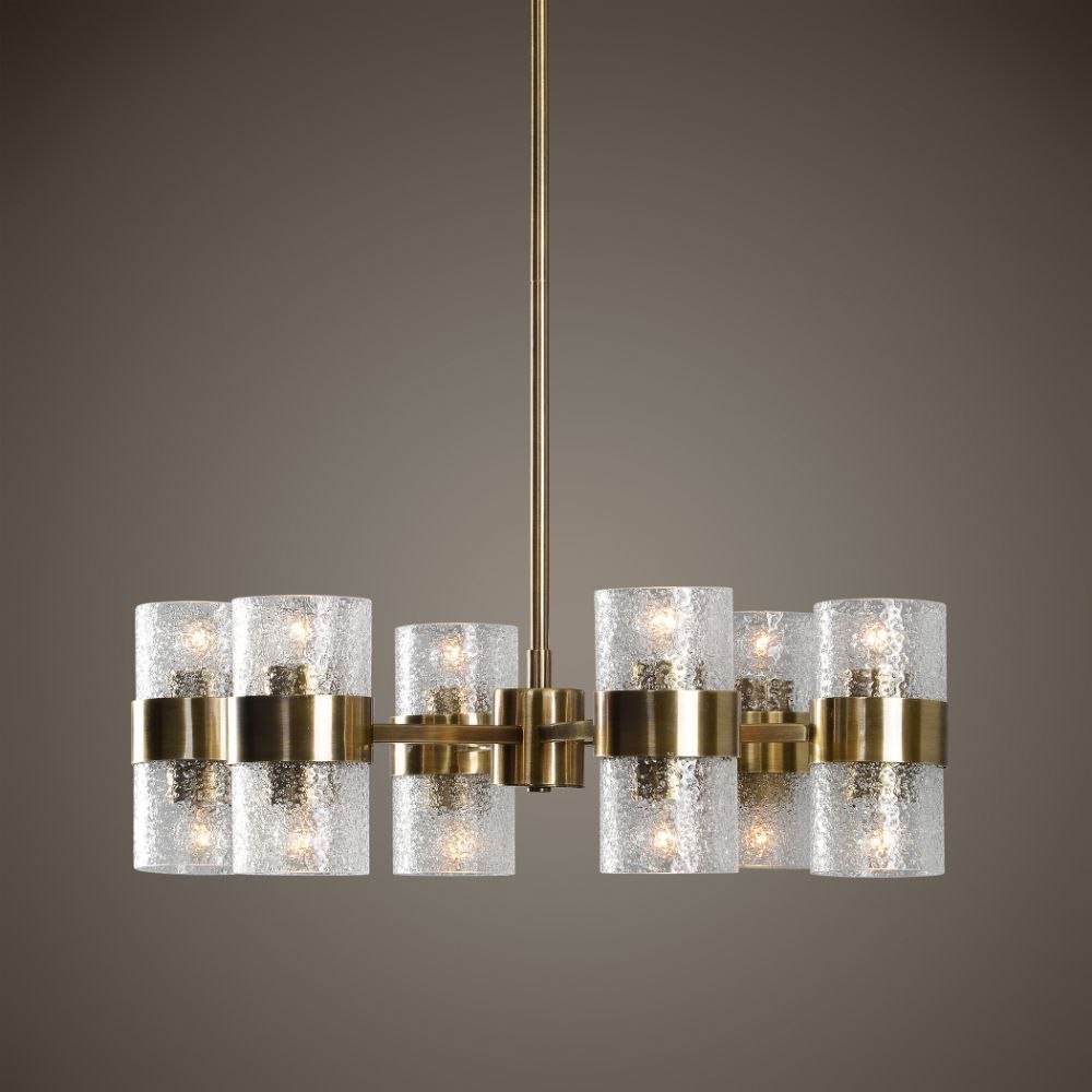 Antique Brass Finish Chandelier Has A Strong Deco Influence in The Design Featuring Thick Textured Clear Glass Cylinder Shades. 12-60 Watt Max Edison Sockets, We Suggest A Type G Bulb for The Best Appearance. Bulbs Not Included. Supplied with 12' Wire, 3-12" Stems and 1-6" Stem for Adjustable Installation.