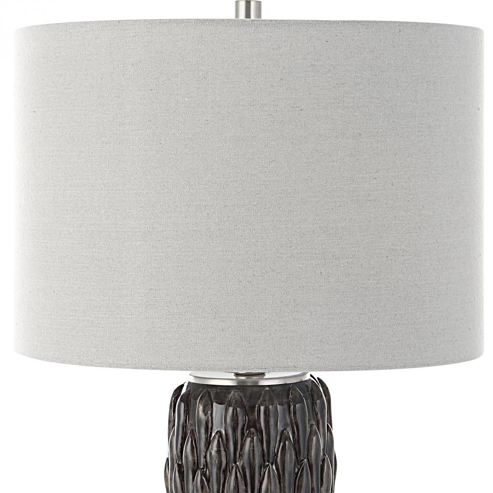 This Ceramic Table Lamp Features A Deep Mushroom Gray Glaze Over Carved Details, Accented with Polished Nickel Plated Details and An Elegant Crystal Foot. The Lamp is Paired with A Hardback Drum Shade in Light Gray.