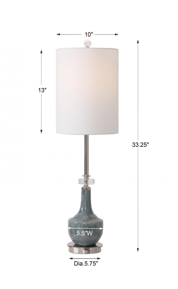 This Buffet Lamp Features A Ceramic Base Finished in A Mottled Blue Glaze with Subtle Rust Distressing. Polished Nickel Plated Details and Crystal Accents Complement This Design. The Round Hardback Shade is A White Linen Fabric.