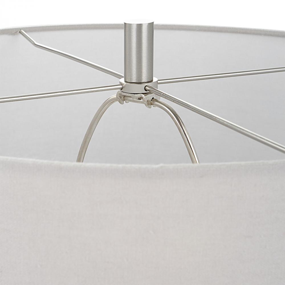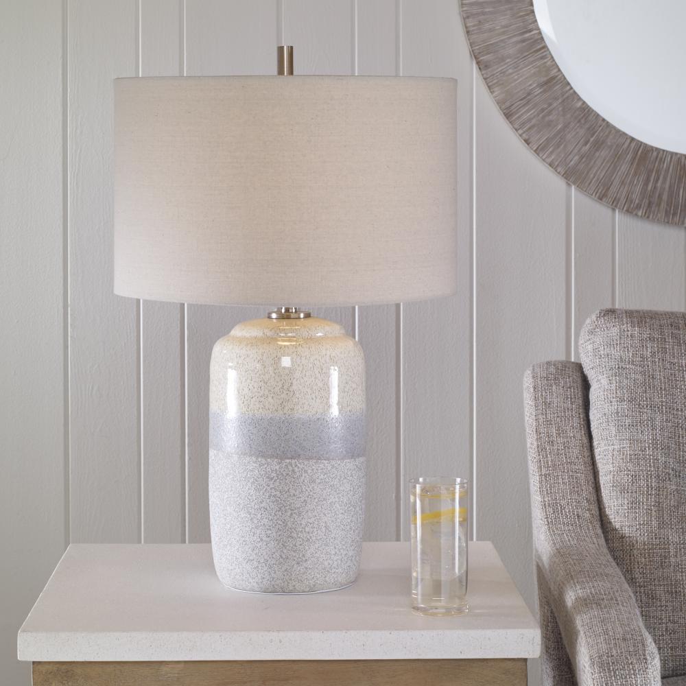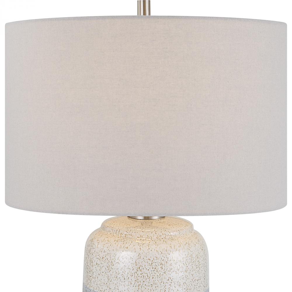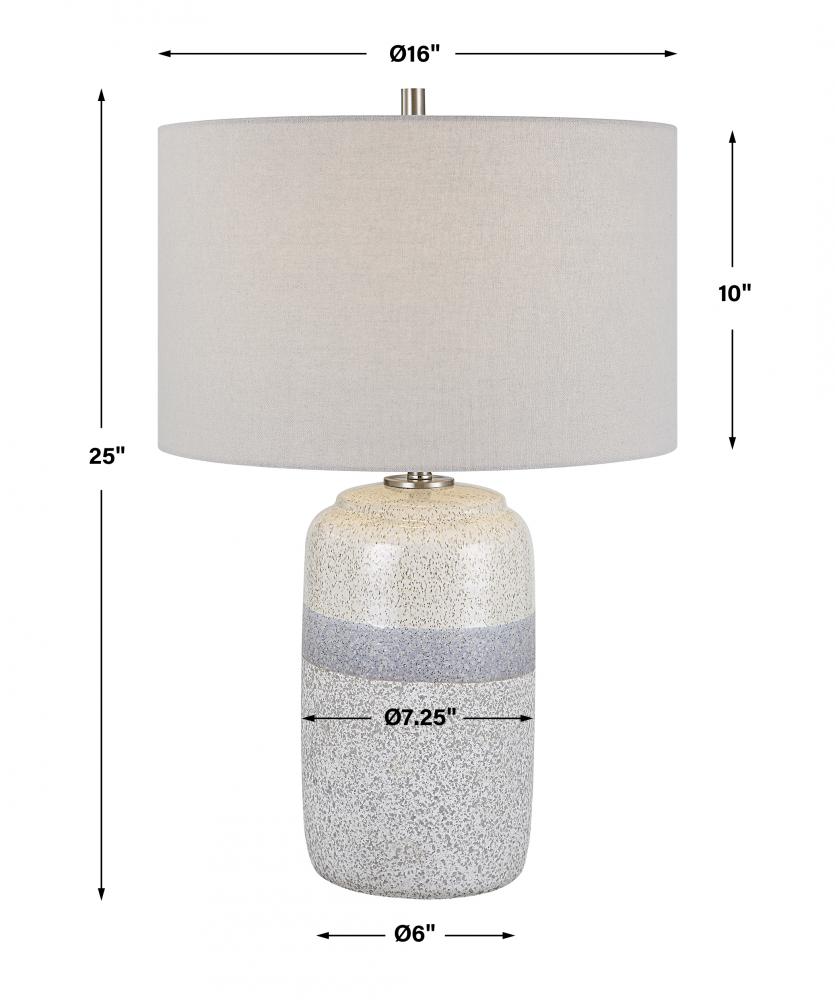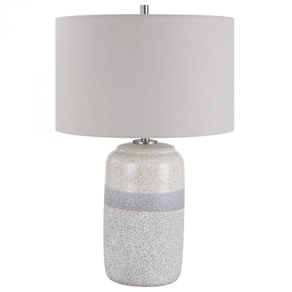 This Ceramic Table Lamp Features A Heavy Mottled White and Gray Bottom Followed By A Cool Gray Center Stripe Topped with A Soft Ivory Cream Accented with Black Specks and Brushed Nickel Plated Details. The Hardback Drum Shade is Covered in A Light Gray Linen Fabric.