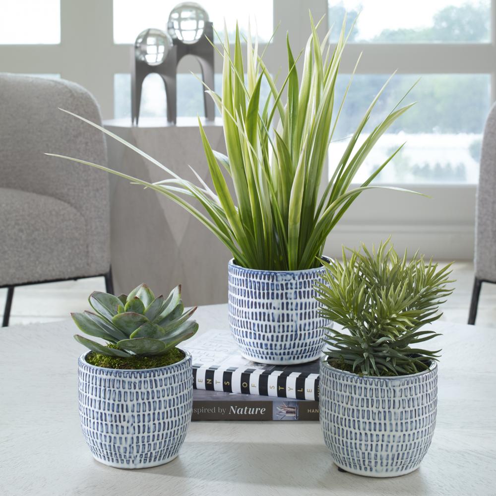 Succulent and Grass Trio Are Accented By Naturally Preserved Moss in Striking Hand Etched Cobalt Blue and White Ceramic Planters. Sizes: Sm-6x7x6, Med-7x8x7, Lg-22x16x22