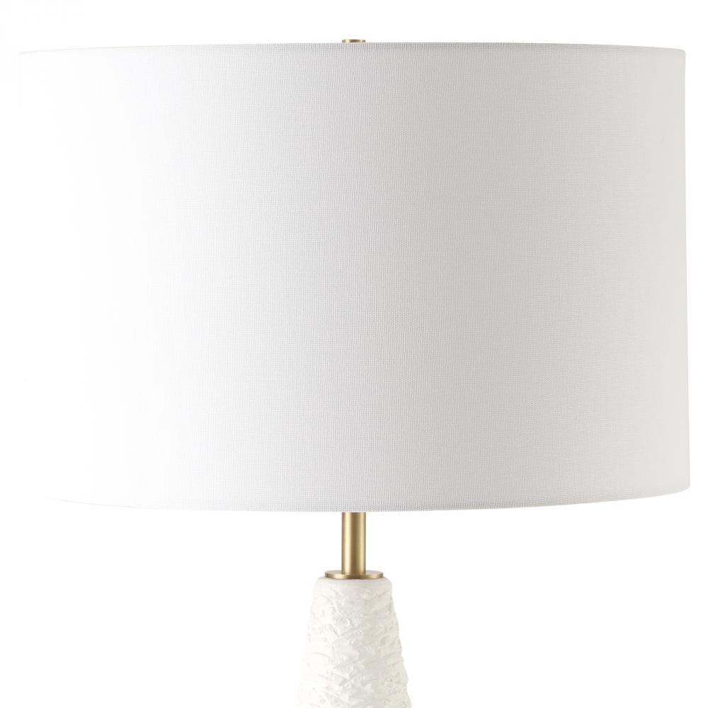 This Floor Lamp Features Heavily Textured White Ceramic That Exudes A Sense Of Artistic Allure, While Plated Antique Brass Details Add A Touch Of Timeless Sophistication. The Round Hardback Drum Shade Is A Crisp White Linen Fabric.