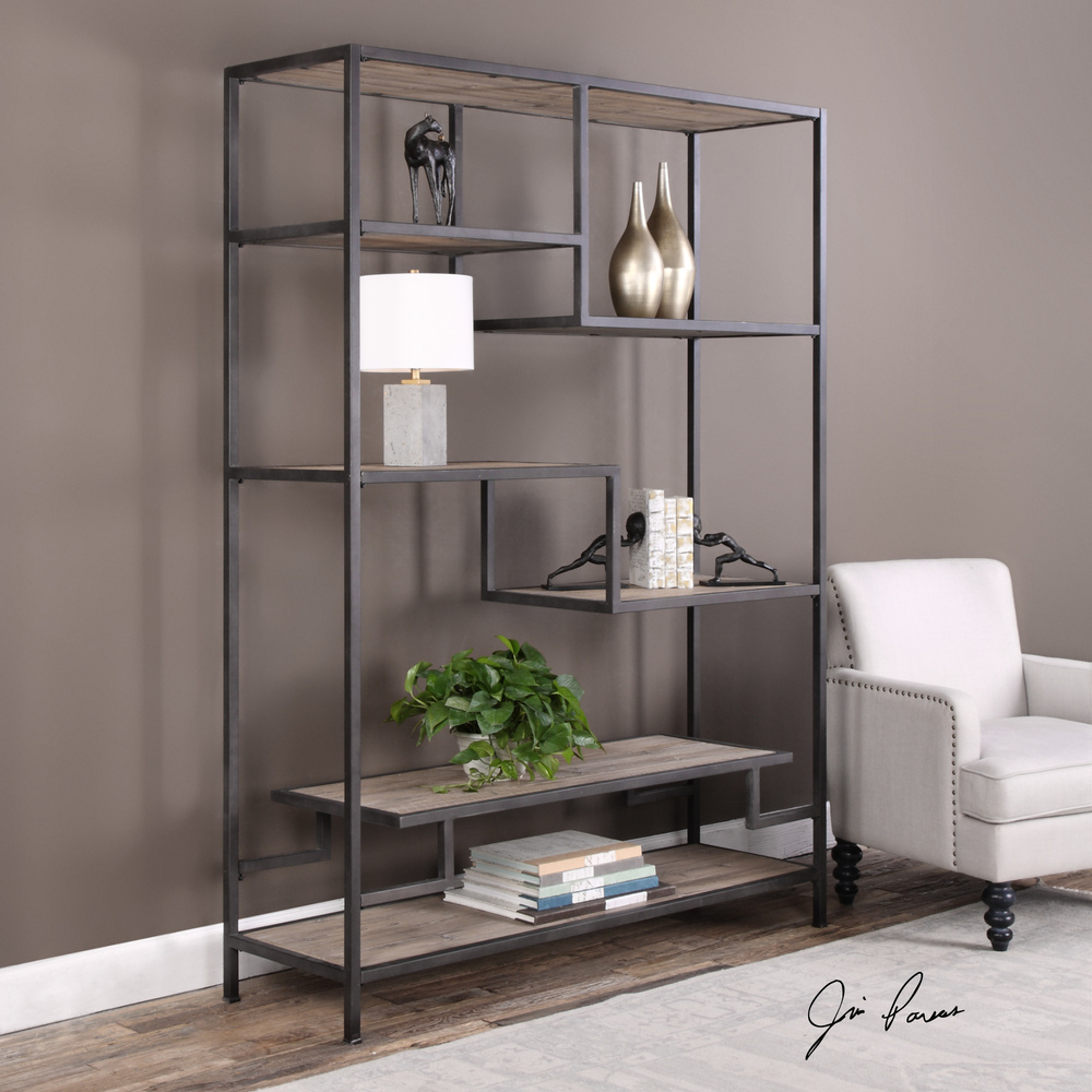 This Six-shelf Design Offers Fun Display Options with Staggered Multi-level Shelving Using Reclaimed Pine Framed in Iron with An Aged Black Finish. Solid Wood Will Continue to Move with Temperature and Humidity Changes, Which Can Result in Small Cracks and Uneven Surfaces, Adding to Its Authenticity and Character.