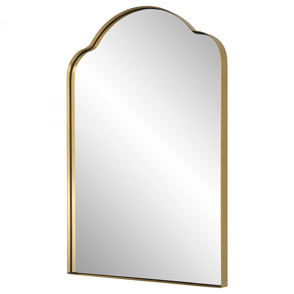 The Sidney Arch Showcases A Gracefully Curved Silhouette with A Plated Brushed Brass Finish Over A Stainless Steel Frame, Surrounding A Floating Polished Edge Mirror.