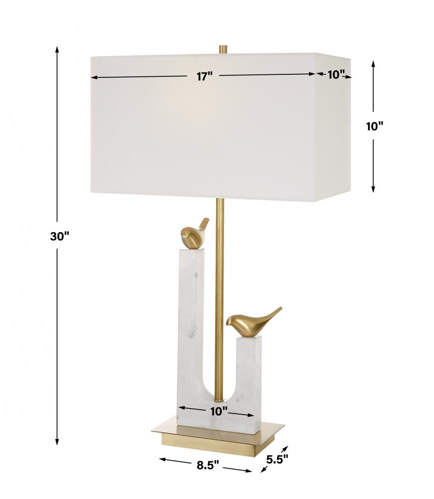 The Songbirds Table Lamp Displays Two Cast Brass Birds Counterpoised on A White Marble Sling Atop A Brushed Brass Plated Iron Base. Complemented By A Rectangular Hardback Shade in A White Linen Fabric.
