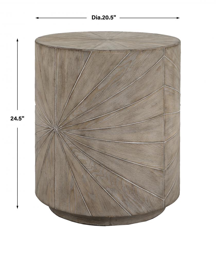 Crafted From Fir Wood Veneer, The Starshine Side Table Features A Starburst Motif Surround Finished in Warm Gray Stain with Light Cerusing That Accentuates The Natural Wood Grain.