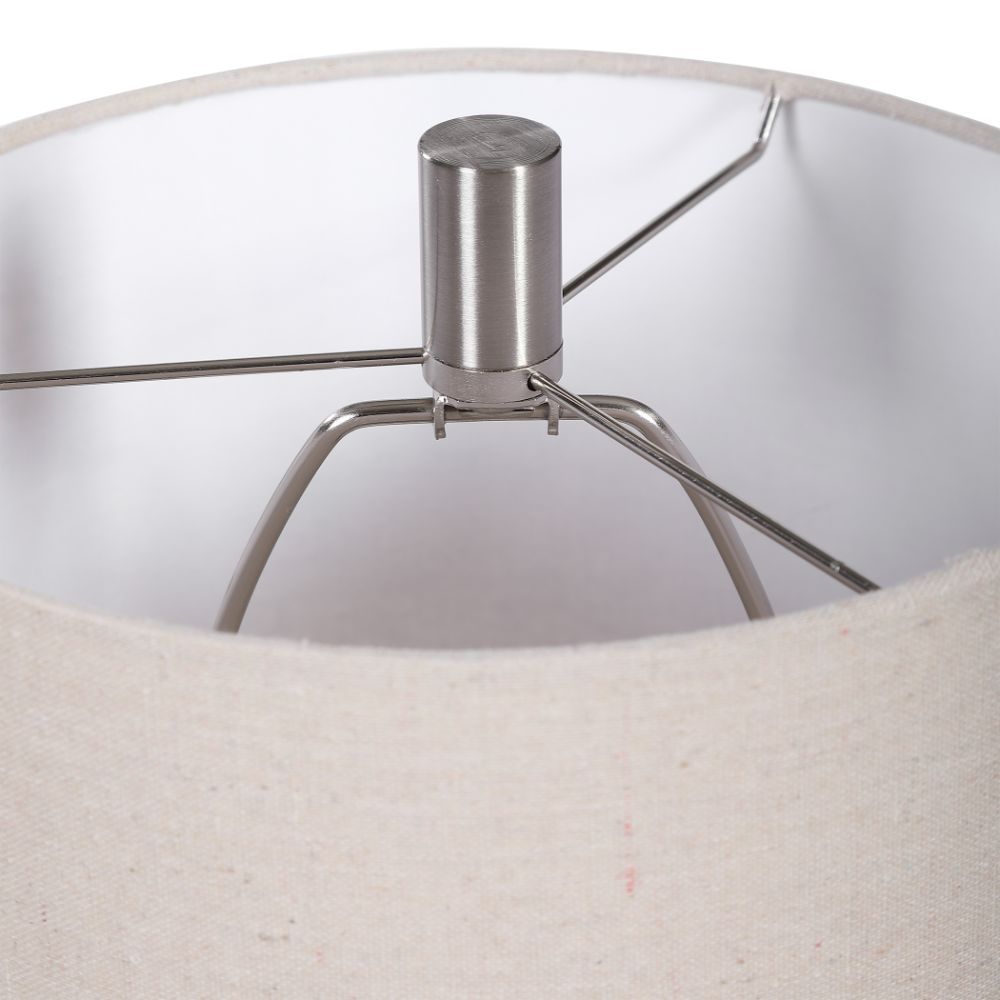A Nod to Classic Mid-century Styling, This Buffet Lamp Has A Geometric Shaped Base with A Bleached Wood Tone Look, Accented By Brushed Nickel Plated Details. A Light Beige Fabric Shade Accents The Piece.