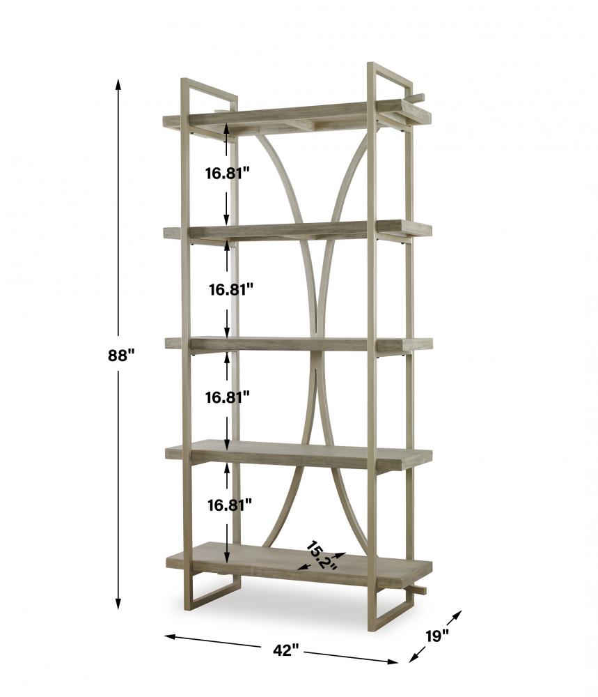 A Classic Contemporary Piece to Transcend Styles, The Sway Etagere Features A Metal Framework Finished in Soft Silver Leaf with Light Antiquing. Shelves Are A Mango Wood Veneer in Distressed Gray with Bone Ivory Undertones.