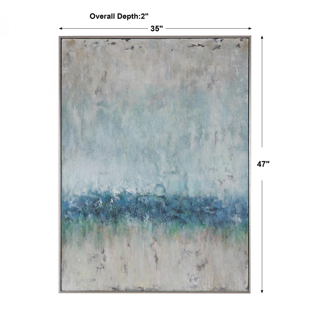 A Modern, Coastal Style is Evident in This Hand Painted Artwork on Canvas. Heavily Textured, Each Piece Includes Shades of Cream, Light Brown, Sea Foam Green, Gray, and Various Shades of Blue. A Petite, Silver Leaf Gallery Frame Encases Each Piece of Artwork. Due to The Handcrafted Nature of This Artwork, Each Piece May Have Subtle Differences.