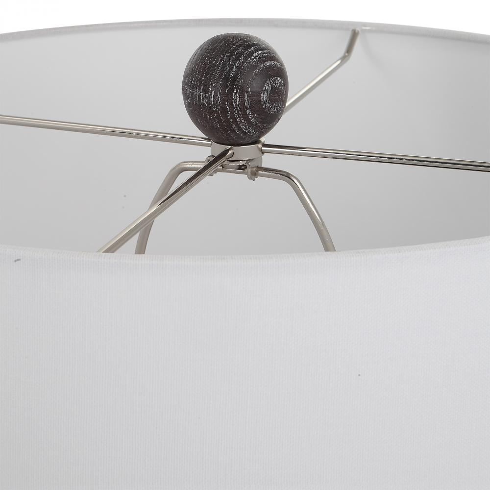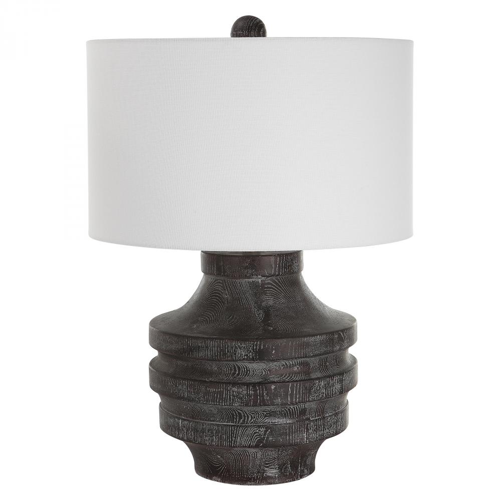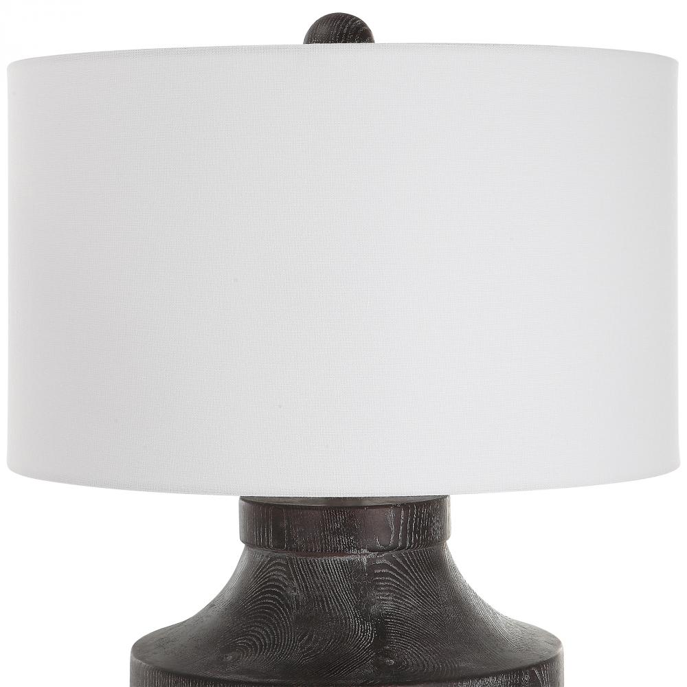 The Perfect Rustic Accent, The Timber Table Lamp Brings The Outdoors in with A Carved Wood Look in A Transparent Black Stain with Warm Undertones and A Light White Glaze Accentuating The Faux Wood Grain. The Hardback Drum Shade is Covered in A White Cotton Fabric.