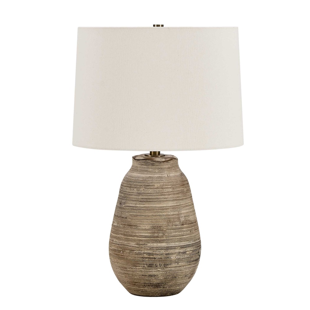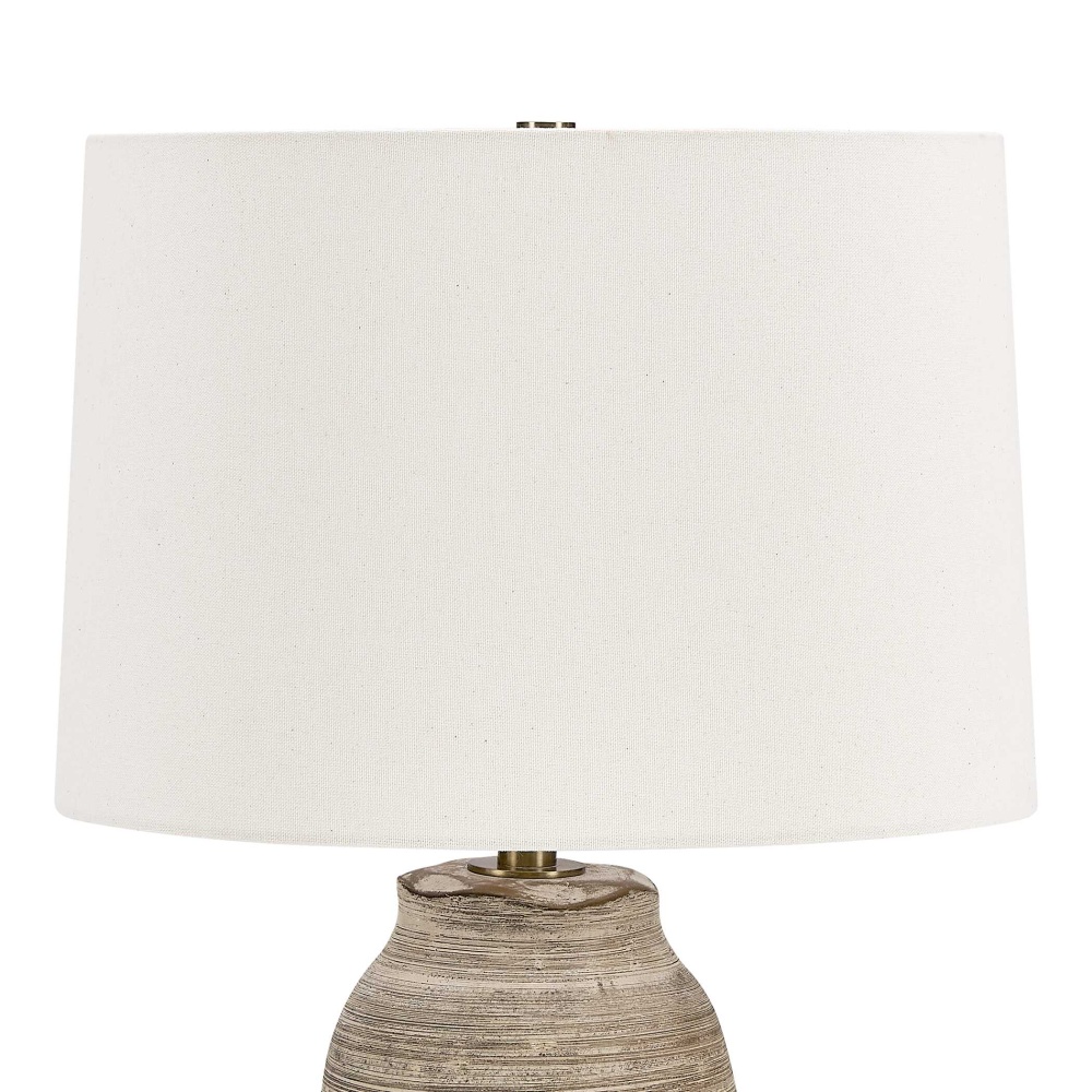 The Tonachio Table Lamp Features A Timeless Urn Ceramic Base With A Unique Scalloped Top Edge And Horizontal Etching, Finished In A Distressed Light Gray Wash With A Rustic Dark Brown Undertone, Accented With Brass Plated Details. The Slightly Tapered Round Shade Is Covered In A Warm White Linen Fabric.