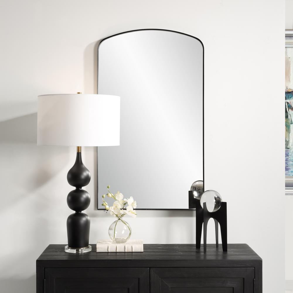 Crafted with A Sleek Iron Frame, The Tordera Arch Mirror Features A Satin Black Finish That Surrounds A Floating Polished Edge Mirror.
