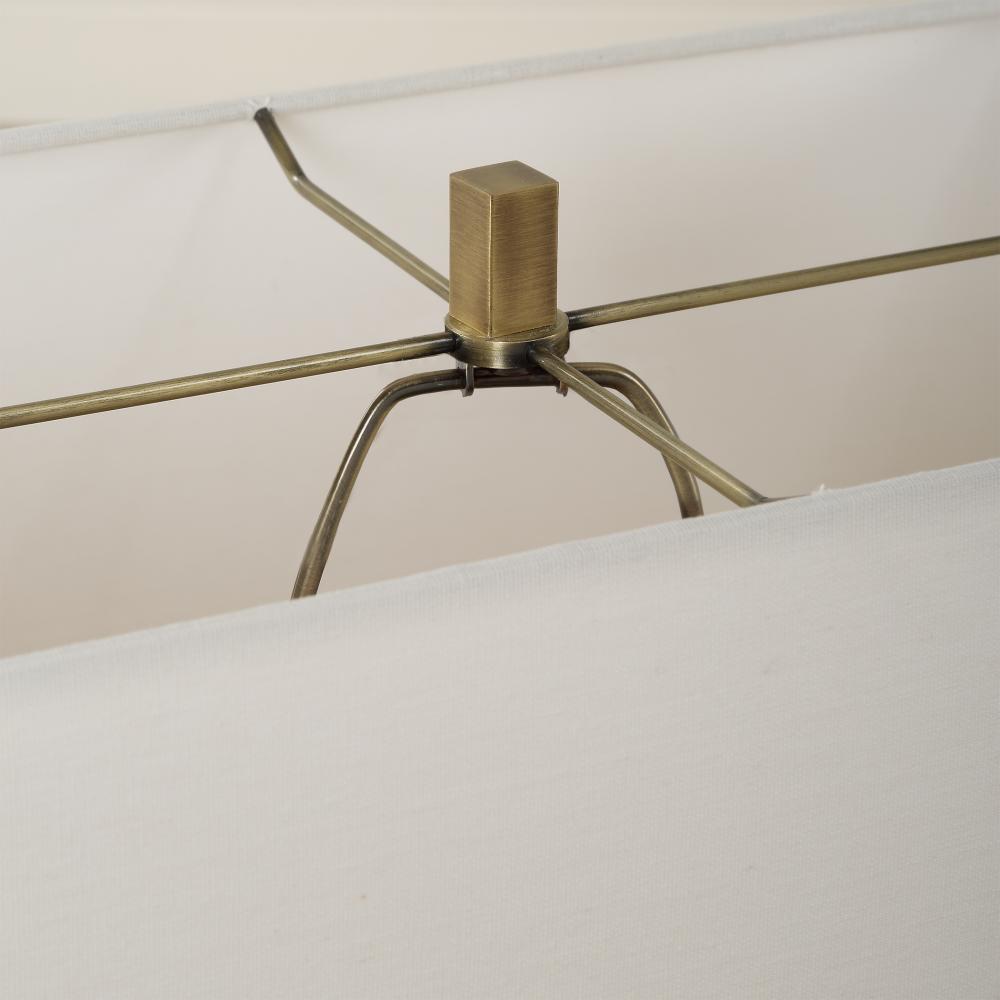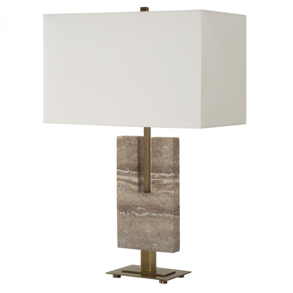 This Striking Lamp Features A U-shaped Unfilled Honed Travertine Design, Artfully Displayed On An Slender Base Finished In An Elegant Plated Brushed Antique Brass. The Rectangle Drum Shade Is Covered In A Crisp White Linen Fabric.