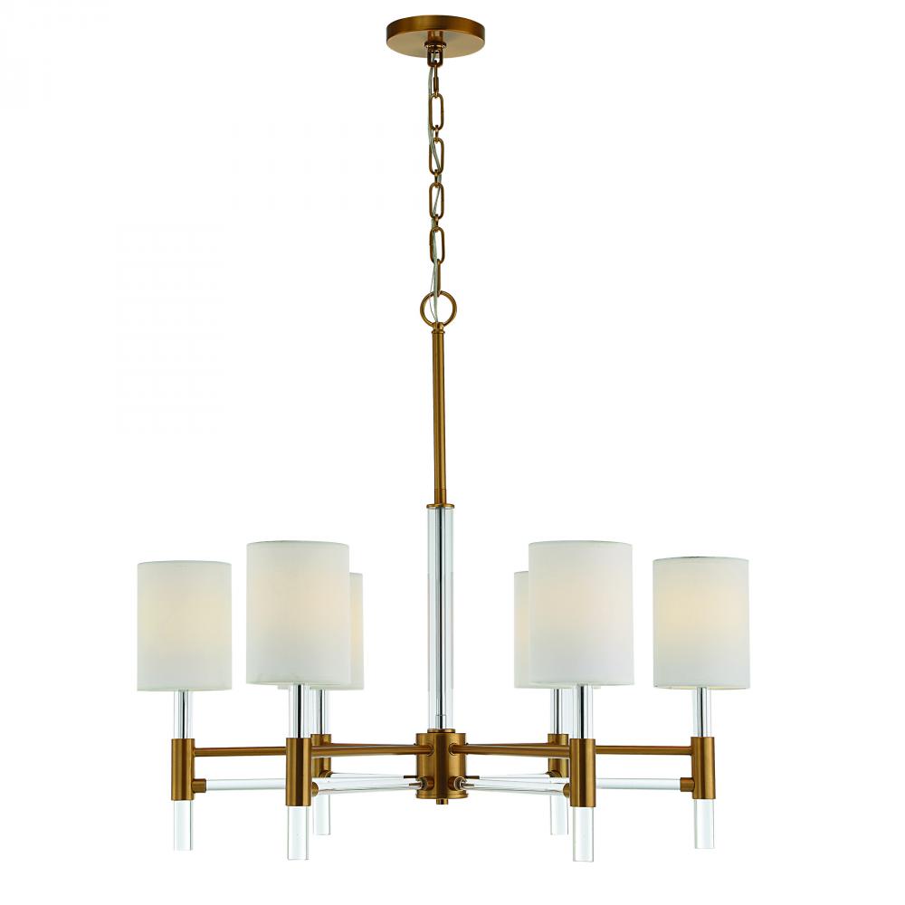 A Traditional Chandelier in A Warm Brass Finish Modernized with A Slender Clear Glass Center Column Featuring Clear Acrylic Accents and White Silken Shades. 6-60 Watt Max Candelabra Sockets. Bulbs Not Included. Supplied with 12’wire, 5’ Chain for Adjustable Installation.