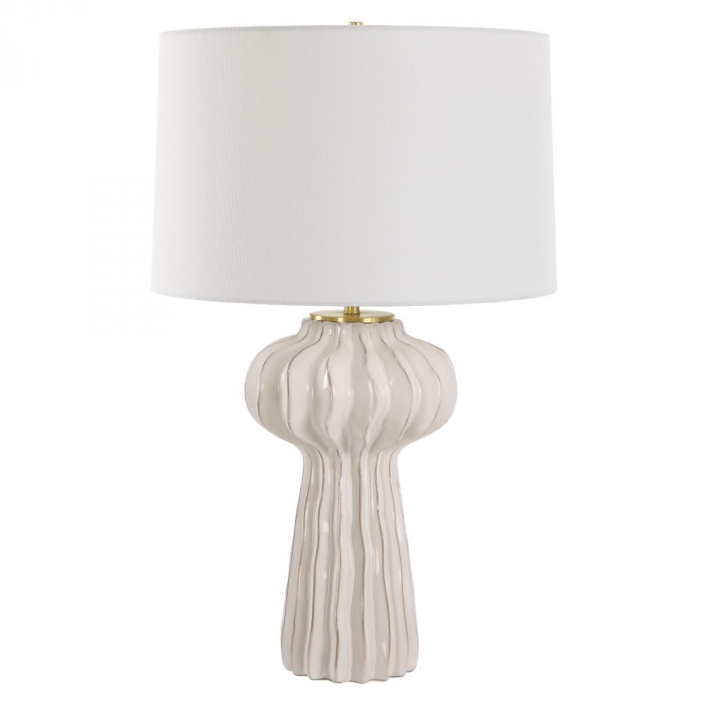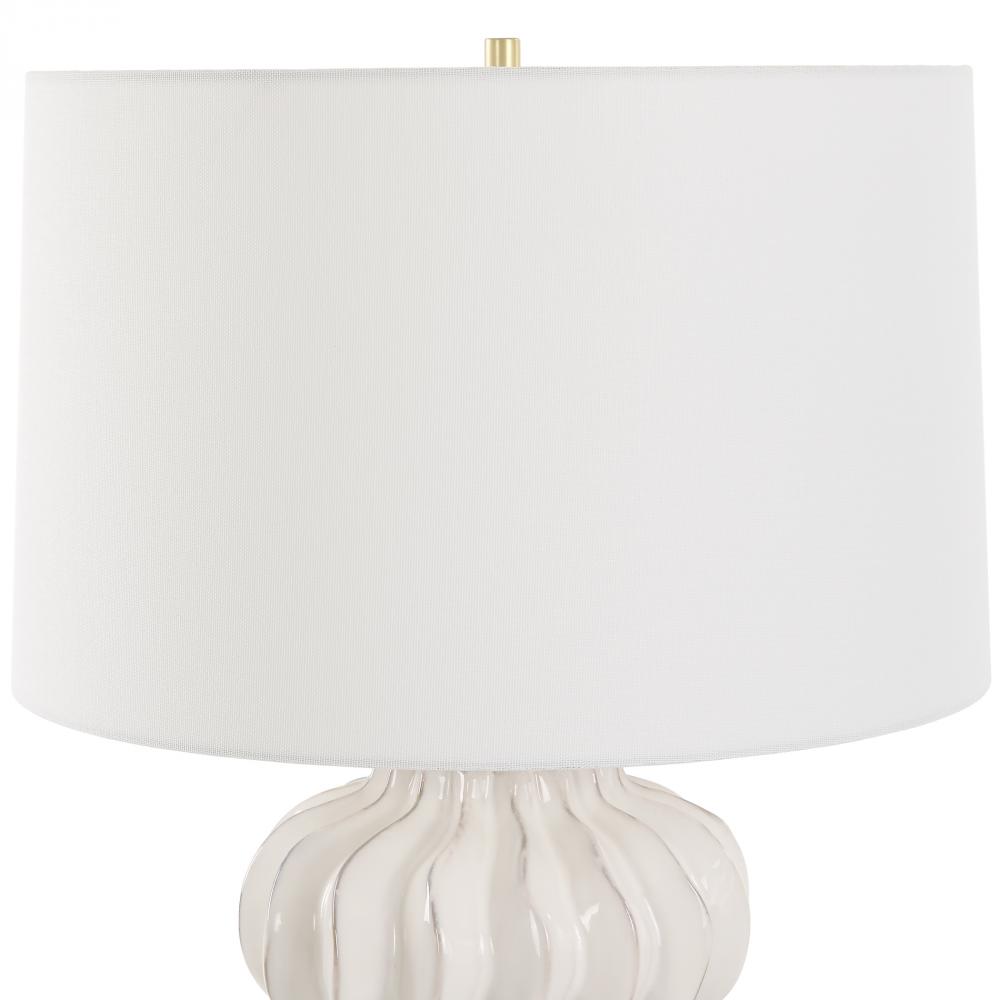 This Porcelain Table Lamp Features An Organic Ridge Detailing Finished in A Glossy Off-white Glaze with Aged Distressing. Steel Hardware is Finished in A Plated Antique Brass. The Round Hardback Shade is Covered in A White Linen Fabric.