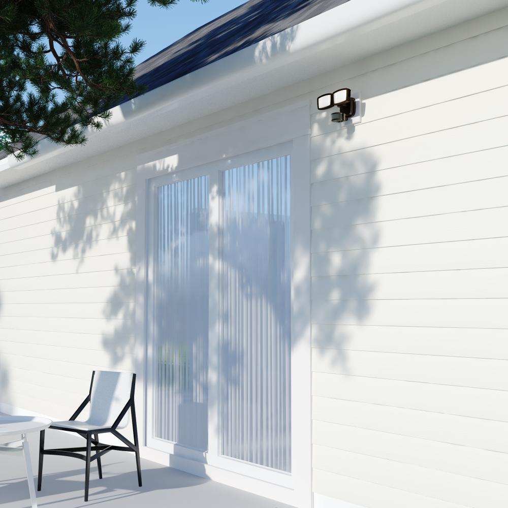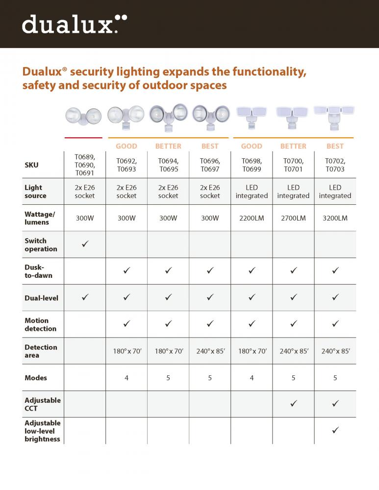 This 2-light integrated LED outdoor motion sensor security light provides CCT adjustable low-level 2700K-5000K ambient lighting throughout the night and 100% bright 5000K high level when motion is detected. The light heads and sensor are fully adjustable and deliver 2700 lumens to keep your home’s exterior brighter at dusk, dimmer at night, and instantly bright when motion is detected. Customize your lighting options with 5 modes of operation plus adjustable motion sensor sensitivity. Suitable for wall or eave mounting with a wide detection area of 240 degrees and 85 feet. This Dualux security flood light expands the functionality, safety, and security of your home’s outdoor spaces with bright, reliable light when and where it’s needed.
