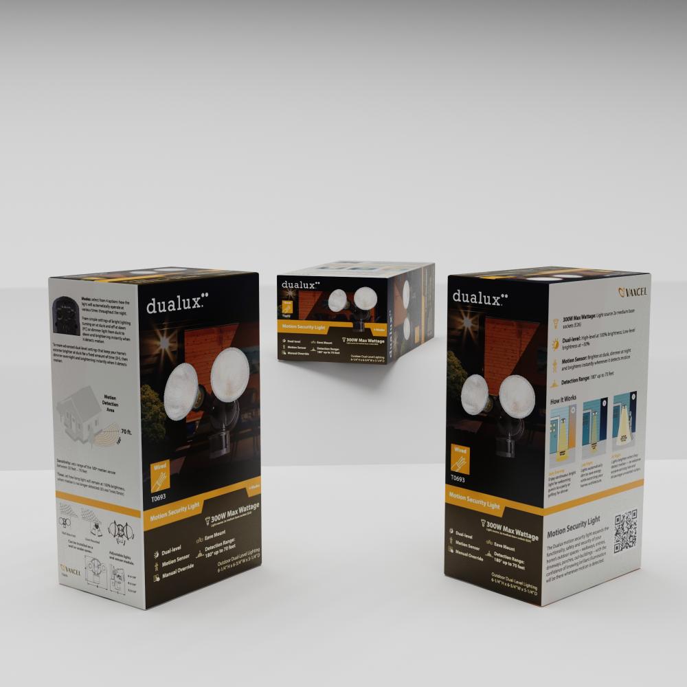 This 2-light outdoor motion sensor security light provides low-level approximately 30% ambient lighting throughout the night and bright 100% high level when motion is detected. The light heads and sensor are fully adjustable to keep your home’s exterior brighter at dusk, dimmer at night, and instantly bright when motion is detected. Customize your lighting options with 4 modes of operation plus adjustable motion sensor sensitivity. Suitable for wall or eave mounting with a wide detection area of 180 degrees and 70 feet. This Dualux security flood light expands the functionality, safety, and security of your home’s outdoor spaces with bright, reliable light when and where it is needed most.