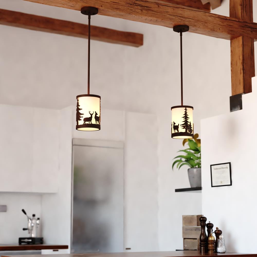 Embrace the serene whispers of the artfully crafted Acadia mini pendant to bring the essence of the wild into your home. The Acadia pendant's textured linen shade showcases bear and deer silhouettes set against a backdrop of evergreen trees. Perfect for kitchens or family rooms of cabins, lodges, or any home seeking to add a touch of nature and rustic ambiance.