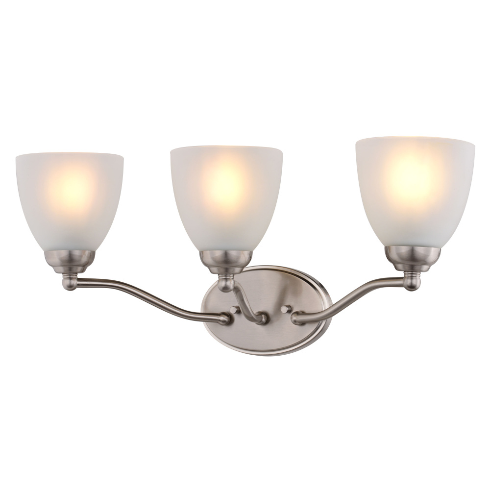 Transform your bathroom's ambiance with the Bellwood 3-light vanity, a perfect blend of classic design and modern sophistication. The satin nickel finish provides a timeless feel, while the frosted glass shades add a touch of vintage charm, diffusing a warm, inviting light. This wall light reimagines traditional style with thoughtfully updated details, including classic sphere accents and graceful tulip glass shades. Damp-rated for lasting performance, the Bellwood vanity is designed to withstand the moisture of bathroom environments. Enhance your daily routine with a fixture that seamlessly bridges traditional charm and modern functionality.