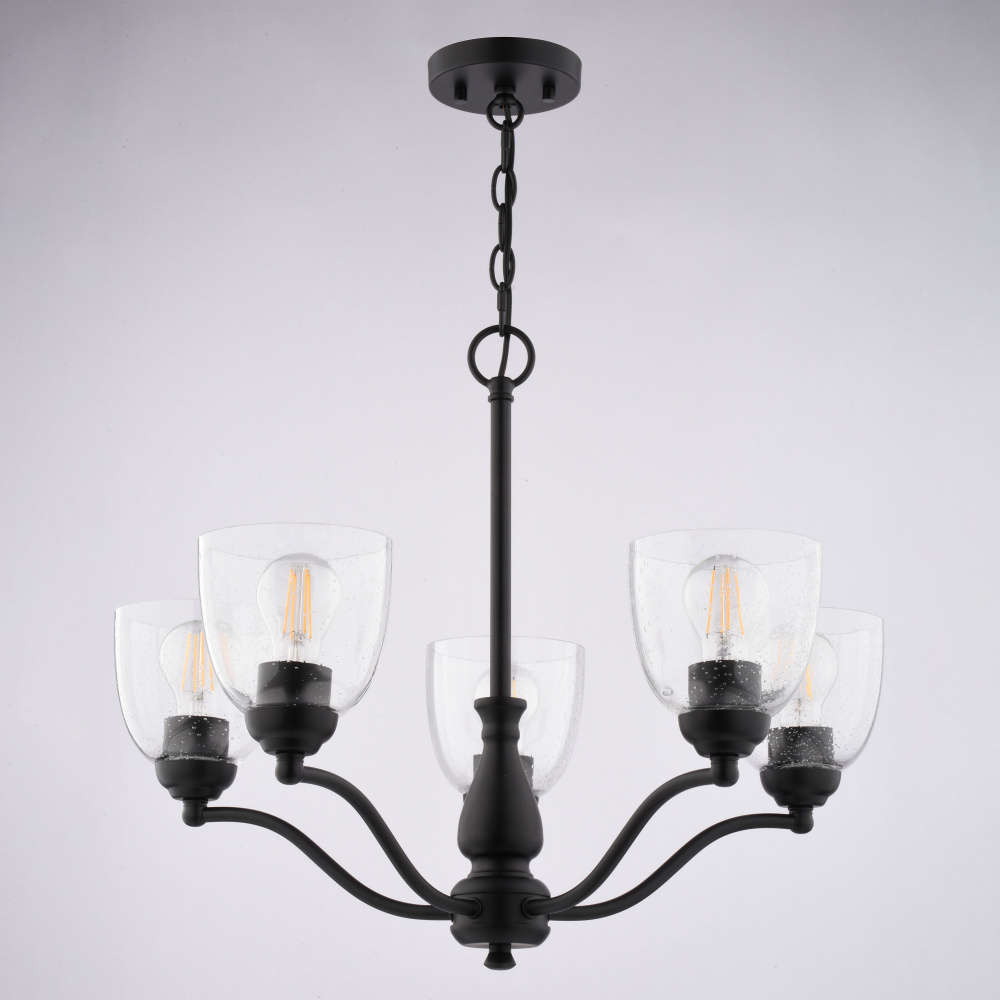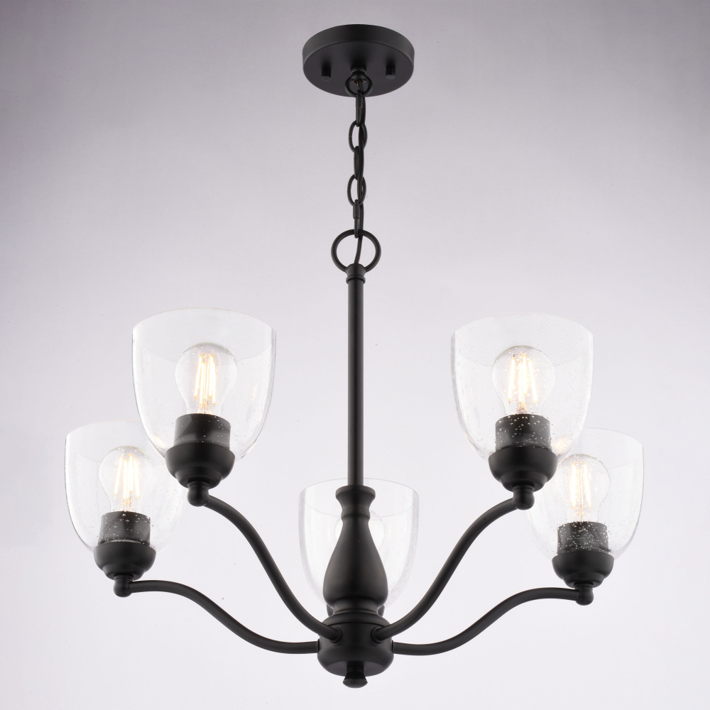 Create a warm and inviting ambiance in your home with the Ballwood 24.5-inch 5-light chandelier. This beautifully designed ceiling fixture features graceful curves and soft, clear seeded glass shades that create a warm and inviting ambiance. The matte black finish complements any color scheme, while the clear seeded glass adds a touch of vintage charm. Enhance your dining room, create a welcoming atmosphere in your entryway, or add a touch of sophistication to your living room with this elegant chandelier.