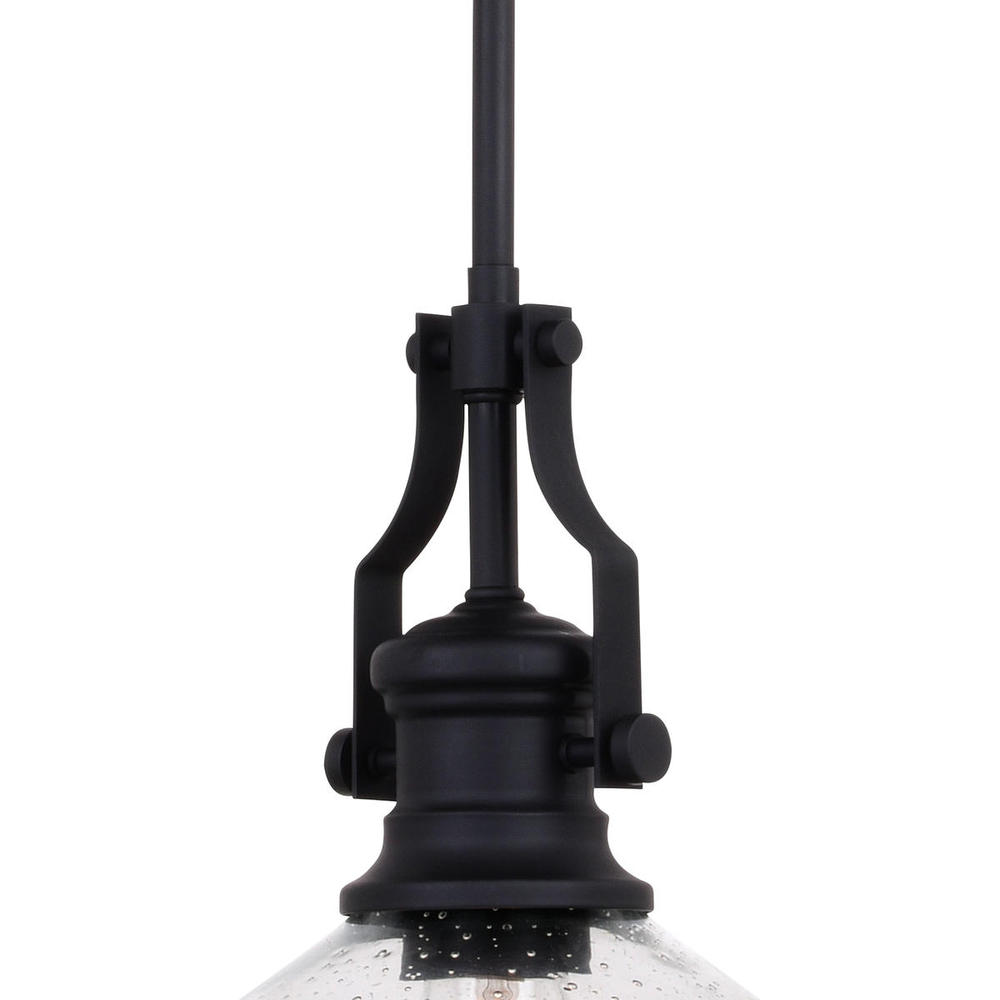 The Beloit mini-pendant adds a welcoming and inviting feel to your kitchen or living spaces. Soft curving lines finished in matte black, are paired with a large clear seeded glass shade, creating a look that accents the most comfortable spaces. Combine that with a vintage Edison style filament bulb to complete the look. Bring a level of sophistication to your trendy farmhouse or urban style with this mini pendant.