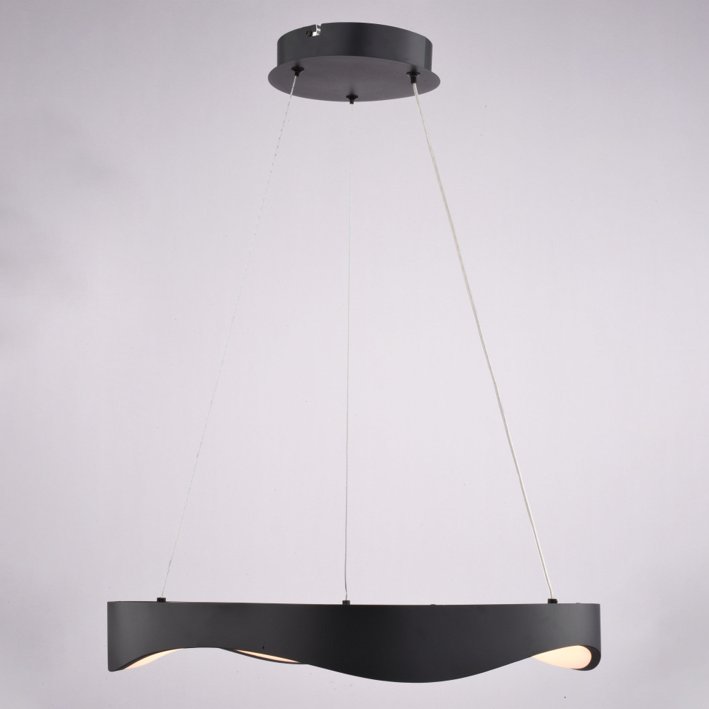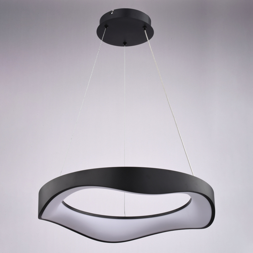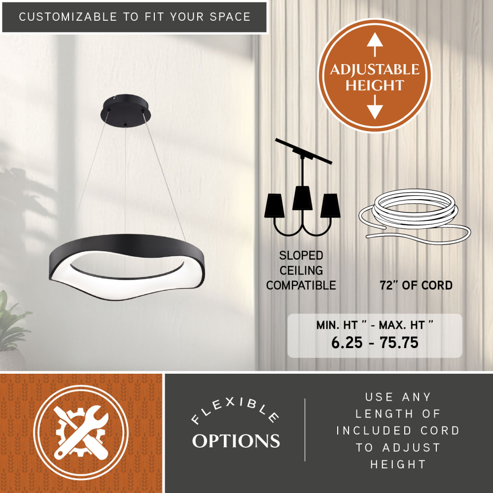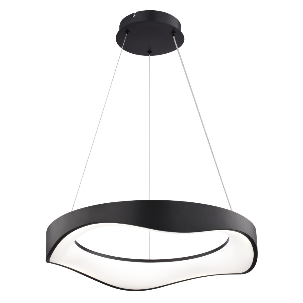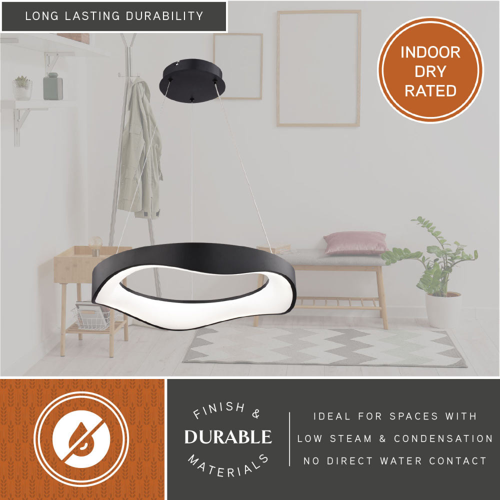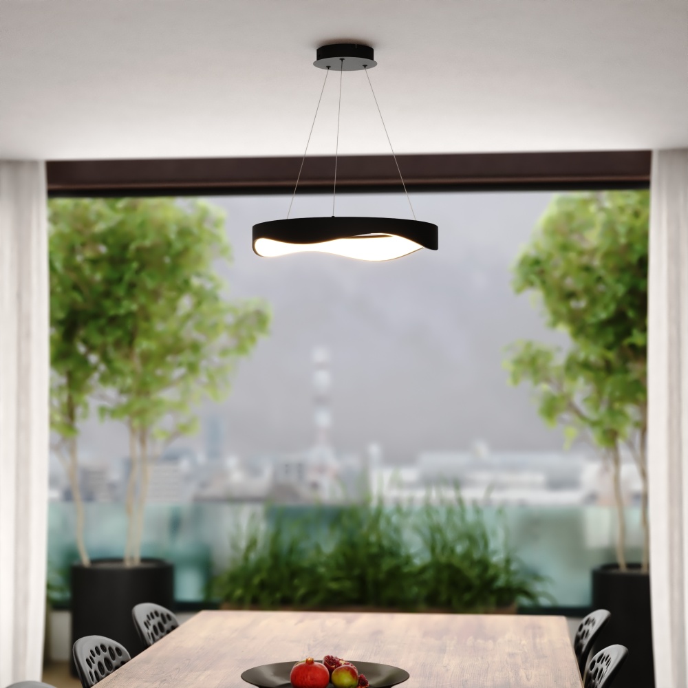Make a statement with the Bowen LED chandelier. Its unique wavy design offers a fresh take on the classic ring silhouette, creating a captivating focal point in any room. Integrated LED technology delivers exceptional energy efficiency and long-lasting performance, while the selectable color temperature (3000K, 4000K, 5000K) allows you to personalize your lighting environment. The textured black finish and frosted white diffuser create a sophisticated look that complements any contemporary space. Ideal for dining rooms, living rooms, entryways, or even a stylish home office. Upgrade your home with the Bowen ceiling light fixture and enjoy the perfect combination of style, technology, and sustainability.