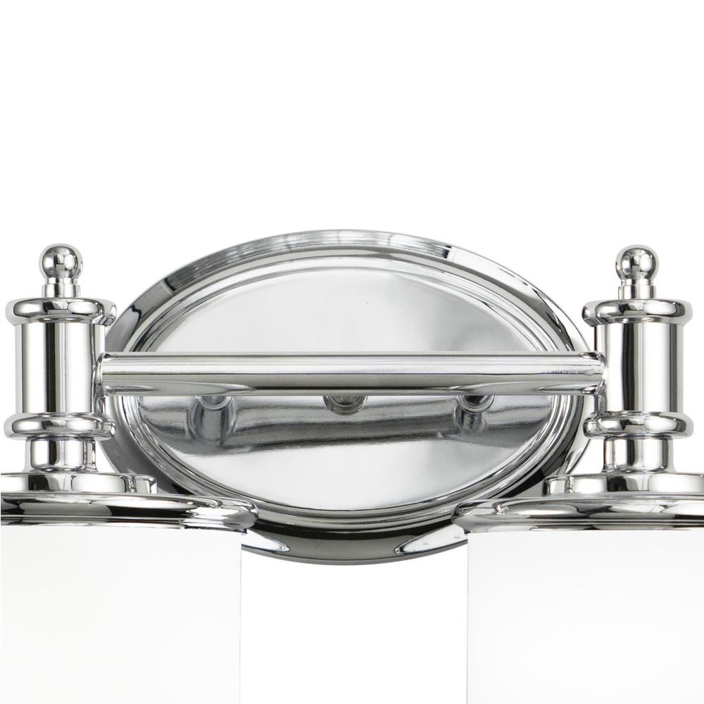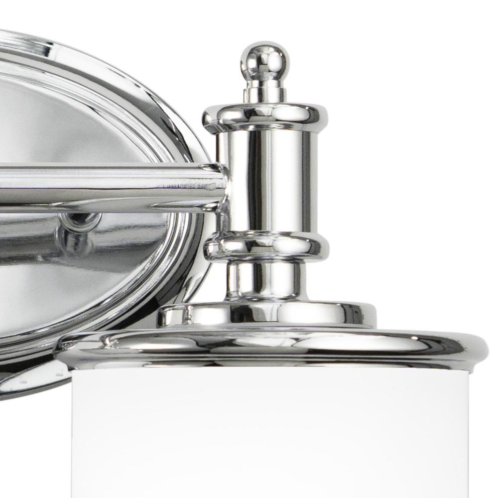 The Carlisle blends formal detailing with relaxed style for a transitional lighting collection that is sure to please. The frosted opal glass cylinders are smartly trimmed in chrome to match the rest of the fixture. This vanity is part of a full collection with coordinating pieces to decorate any room in the house. Versatile reversible mounting option lets you install this fixture up or down.