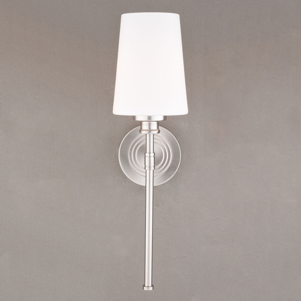 Classic styling and elegance come together in perfect harmony with the Clark collection. The smooth nickel finish provides balance to the frosted opal glass shade. This wall sconce is ideal for bathrooms, hallways, stairways, foyers, and more.
