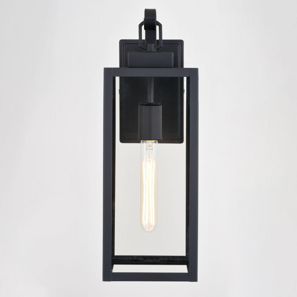 Elongated and slim, the Clinton collection is both simple and elegant. The wall light is made up of clear glass, encased in a weather resistant matte black metal frame at a key price point. The lantern's top curved handle accents the geometric frame for a unique look. When lit, a warm inviting glow illuminates through the clear glass, making it a perfect piece for both indoor and outdoor settings. The overall monochrome theme of the fixture adds a sense of minimalistic elegance to any transitional or contemporary decor.