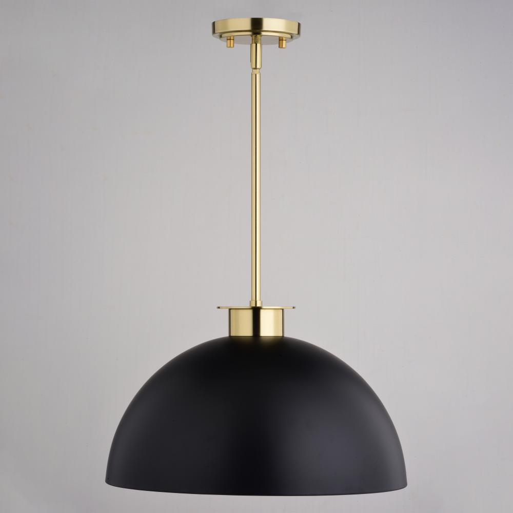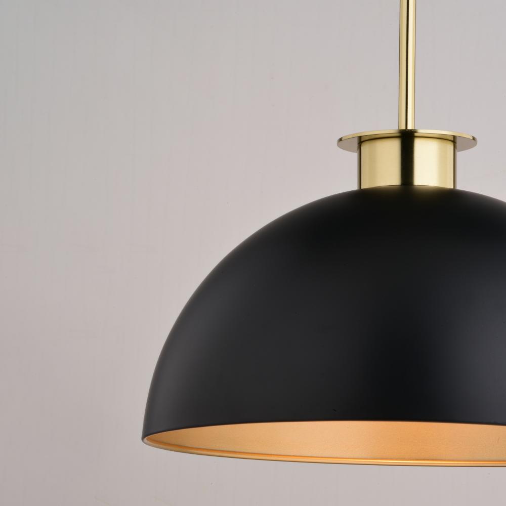 The Devon collection showcases a ceiling light that exudes elegance and simplicity at a great price point. The classic matte black dome shape is complemented beautifully by gold satin brass accents which adds a luxe touch to the overall design. The golden interior casts a soft glow of focused light and shows off the light's blend of modern minimalism and classic elegance. This pendant works well with many mid-century modern and contemporary decors whether it’s your kitchen, breakfast nook, home office or entryway.