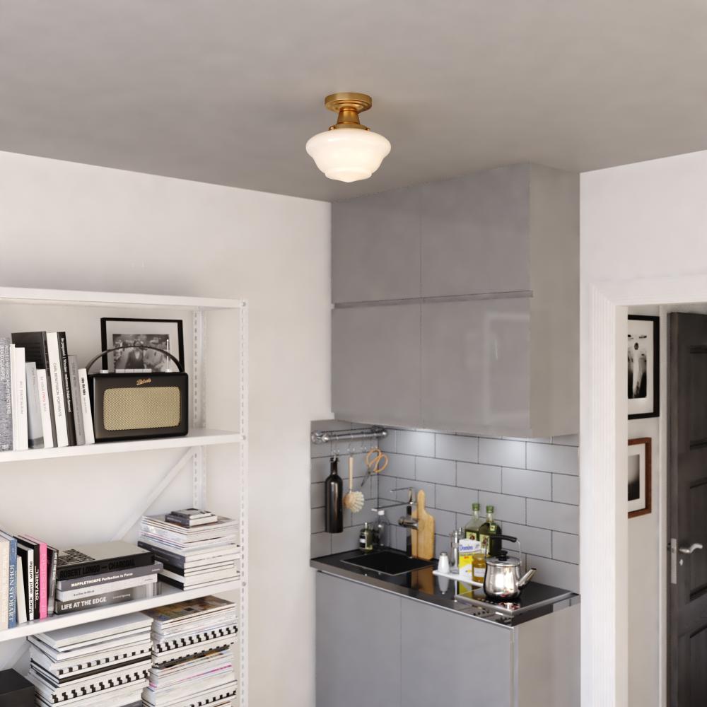 Add a touch of vintage charm to your home with the Eastgate semi-flush light's classic schoolhouse design. Its timeless shape and versatile gold finish make it a perfect addition to bedrooms, bathrooms, hallways, or entryways. Enjoy the warm and inviting illumination as the Eastgate light enhances your space with its nostalgic glow.