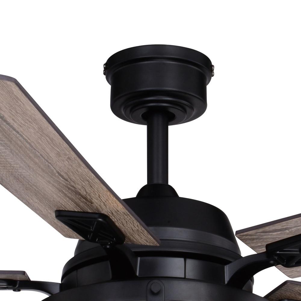 Farmhouse charm is exemplified in the Elburn collection. A black finish strongly accentuates the drum shaped cage shade that sits just below the wooden fan blades. This ceiling fan will bring comfort and warmth to any room in your home.