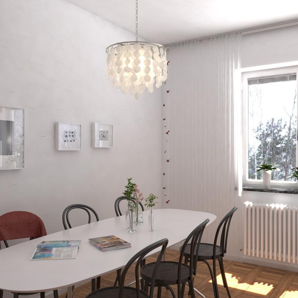 Soft contemporary styling combined with texture and iridescence. The Elsa collection pendant is a unique option to lighten and liven up your kitchen, dining area, or foyer. Tiers of hand-strung natural Capiz shells create a soft diffused light that perfectly compliments the satin nickel metal elements. This is a full collection with coordinating pieces to decorate any room in the house. Features candelabra lamping, frosted bulbs recommended for best appearance.