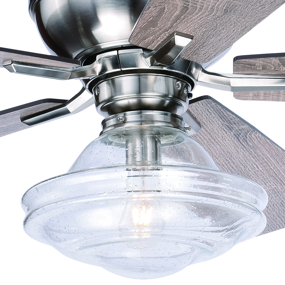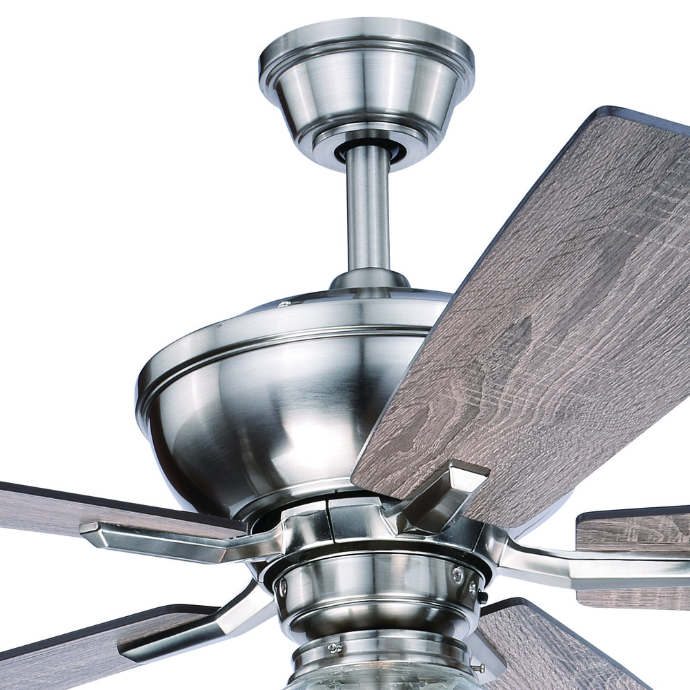 A modern rustic aesthetic best describes the new Huntley fan. A bronze or satin nickel motor is warmly met with wood fan blades. A generously sized clear seeded schoolhouse glass globe compliments the rustic design. The Huntley is a welcoming addition to any interior space of the home.