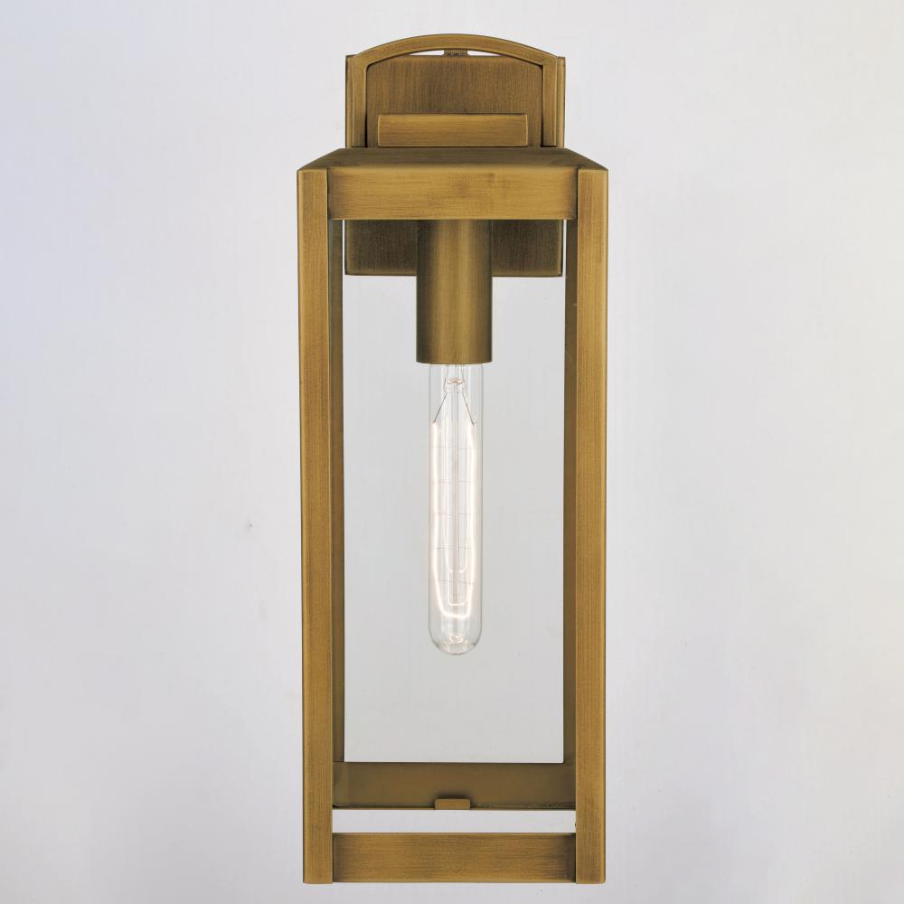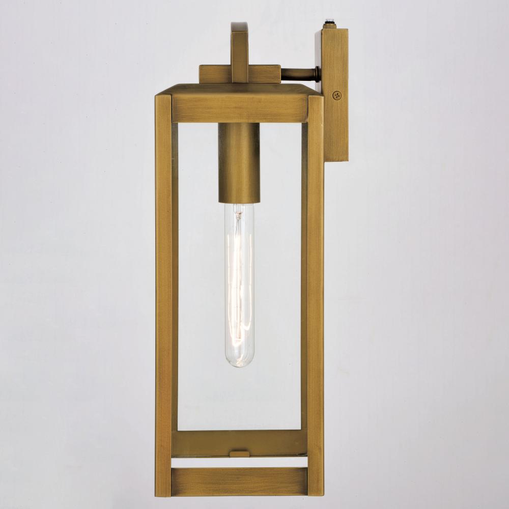 Elongated, slim, clear flat glass panels frame the Kinzie for a clean, contemporary feel. The oblong lantern handle and rectangle shape adds an additional design element to this outdoor wall light collection. Finished in gold vintage brass, the Kinzie creates a bold but understated look perfect for highlighting your space. Combine that with vintage Edison style filament bulbs to complete the look. This wall lamp is ideal for your porch, patio, entryway, garage, or any other outside area of your home.