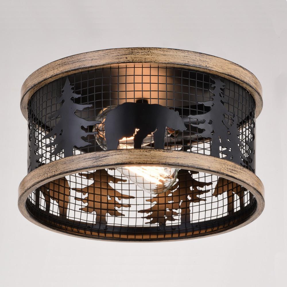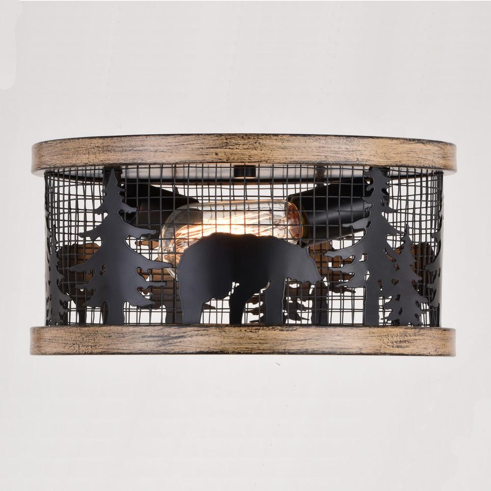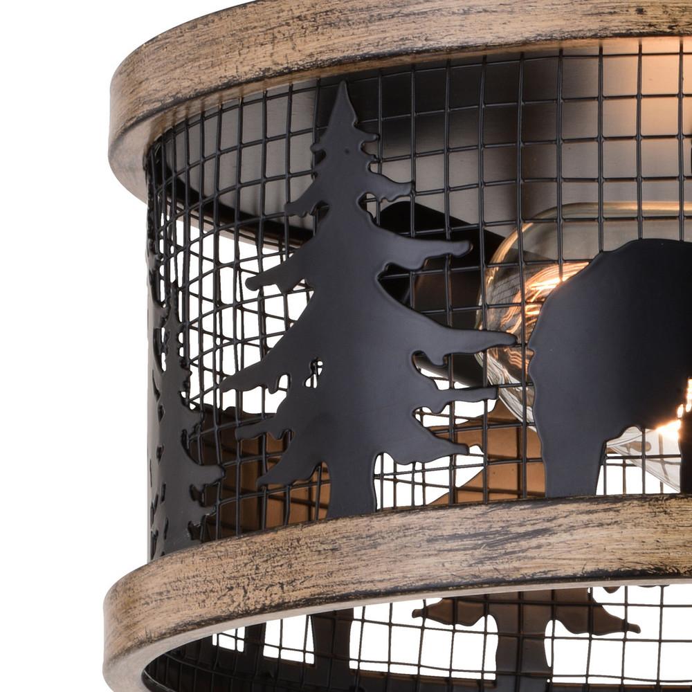 Get wild with this drum style ceiling light called Kodiak. The pairing of the black and burnished teak finish enhances the on-trend metal cage perfectly. Capture your love of nature with pine tree and bear silhouettes. It is an excellent choice for a vacation lodge, cabin or suburban home and complements a variety of home styles: anywhere you want to bring an element of nature. Rated for damp locations, it can be used in any bathroom, family room, or any other area of your home.