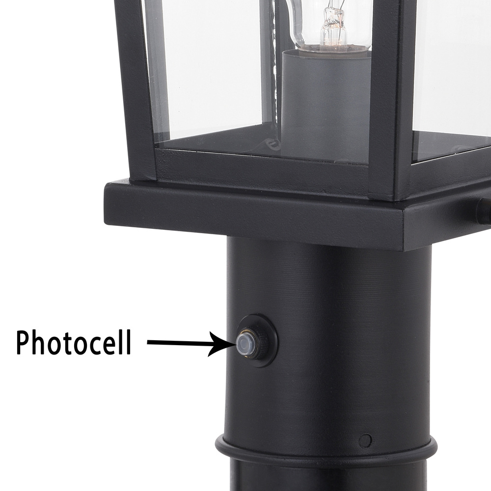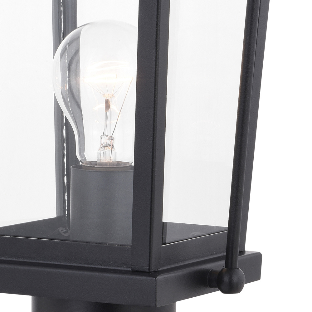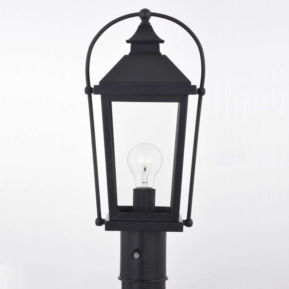 The colonial inspired Lexington collection is steeped in traditional charm. A textured black finish coupled with tapered, clear glass panels are further enhanced with a curved metal lantern handle creating a carriage house lantern look. Combine that with vintage Edison style filament bulbs to complete the look. This post light mounts on a 3-inch diameter post (not included). Ideal for illuminating your yard, driveway, or any other area of your home.