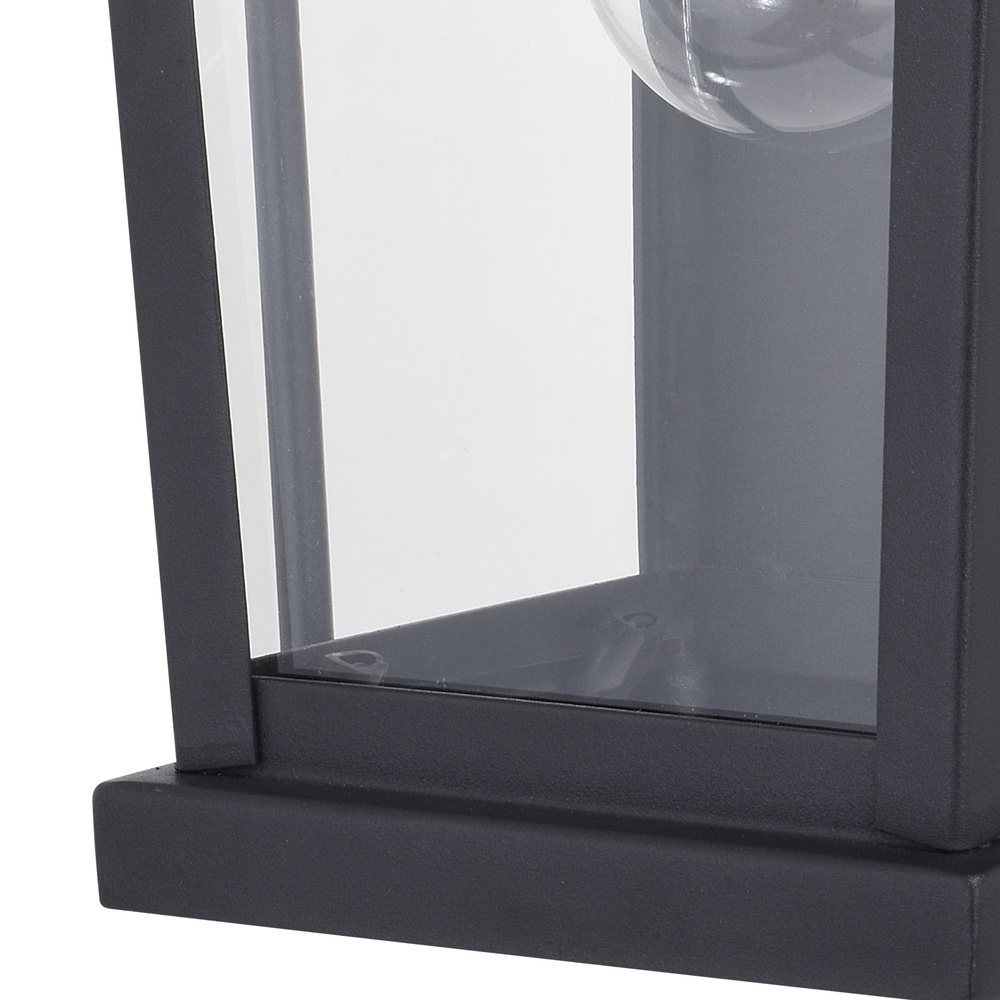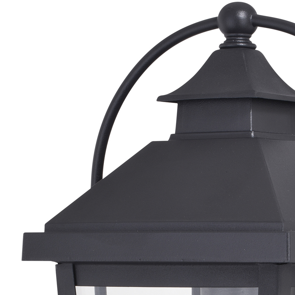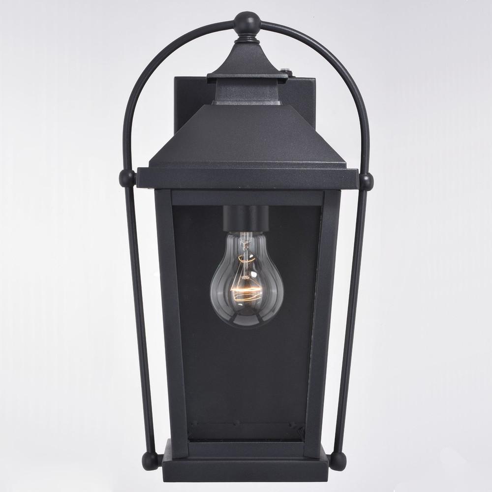 The colonial inspired Lexington collection is steeped in traditional charm. A textured black finish coupled with tapered, clear glass panels are further enhanced with a curved metal lantern handle creating a carriage house lantern look. Combine that with vintage Edison style filament bulbs to complete the look. This outdoor wall light is ideal for your porch, entryway, garage, or any other area of your home.