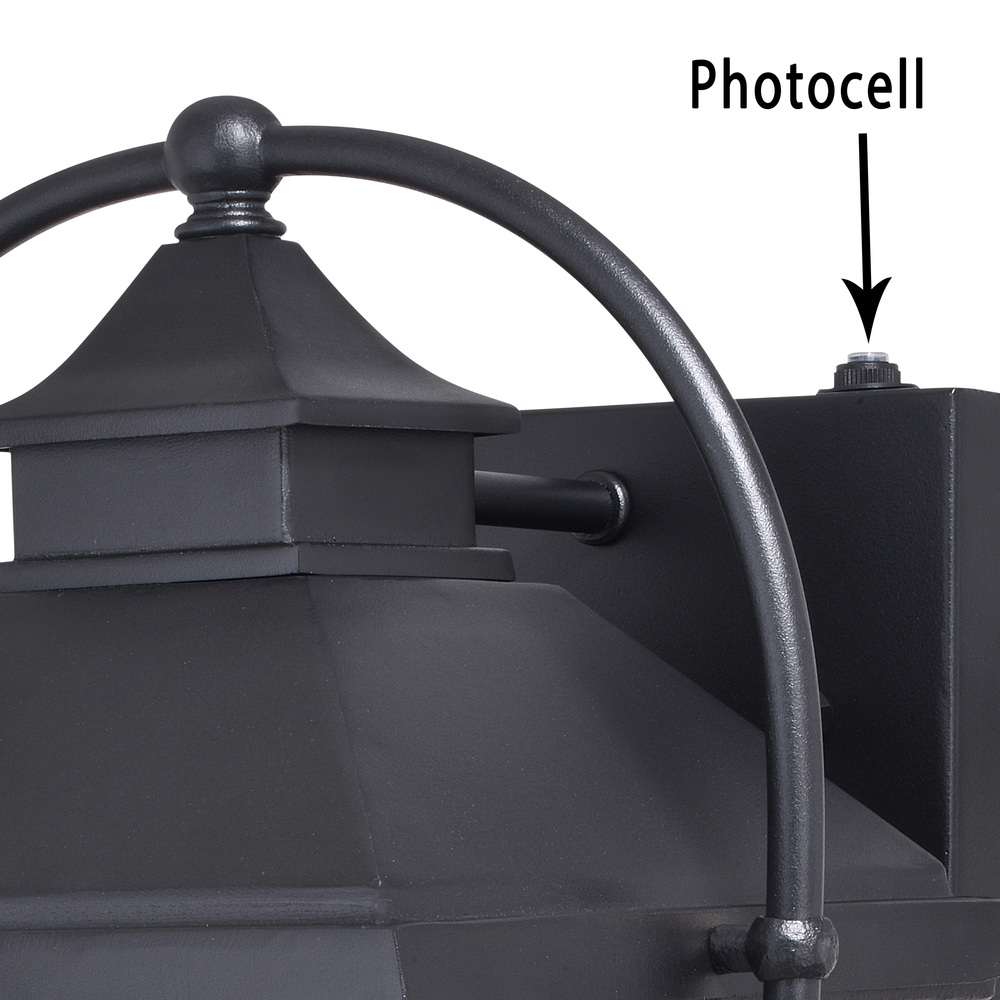 Dusk to dawn photo cell automatically turns fixture on in the dark and off in the light for added safety and security, saving energy during daylight hours