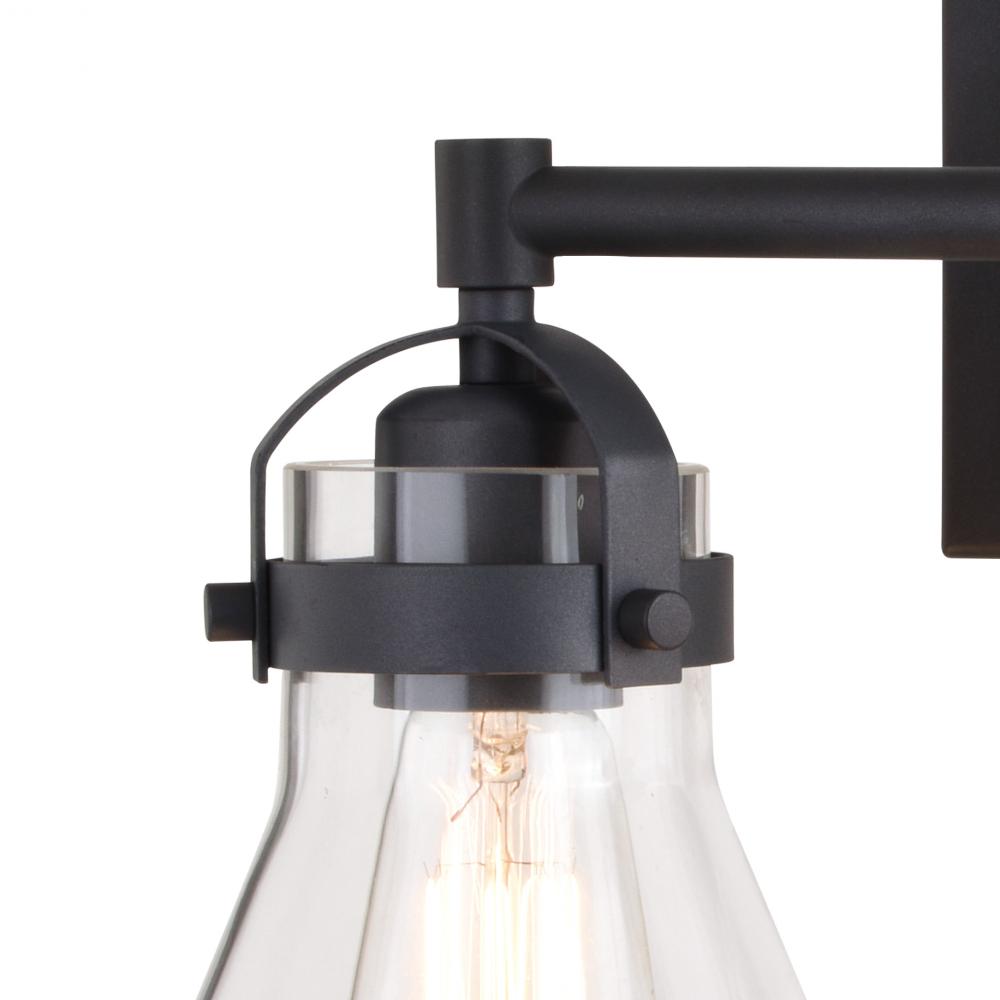 A nod to farmhouse and industrial aesthetics are realized in the Mason vanity collection. Charcoal black accents offer a striking contrast to each funnel shaped shade. As they sit perched along a horizontal support, a brilliant show of light pours from each shade, creating a bright shine on the subject below. This 2-light vanity is ideal in any bath, or interior space where extra light is welcomed.